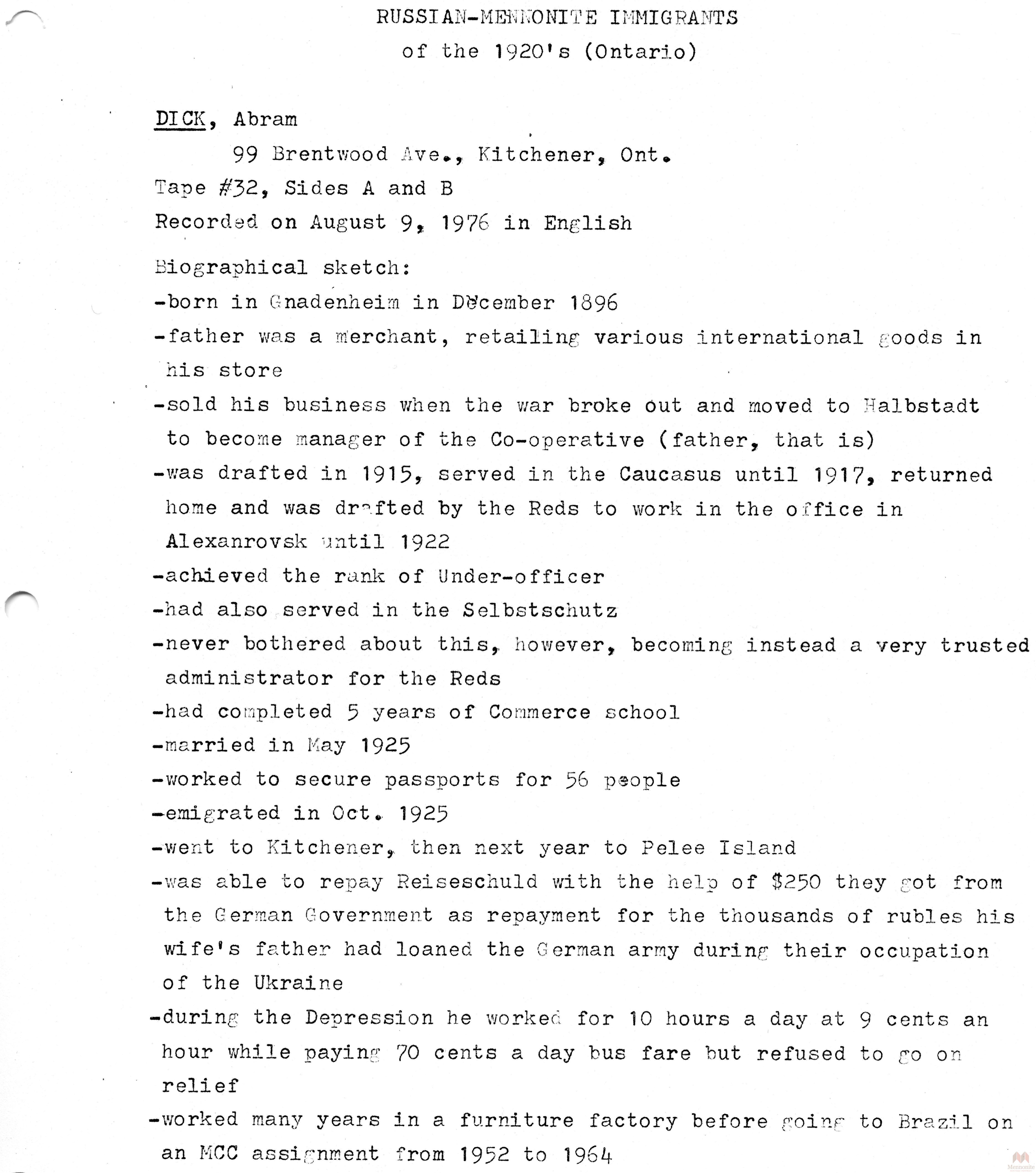 Keywords Abram Dick, Mennonite, Russia, Russian, emigration, interview, oral, history, immigration, immigrants, Canada, Ontario, 1920s, transcript, biography,