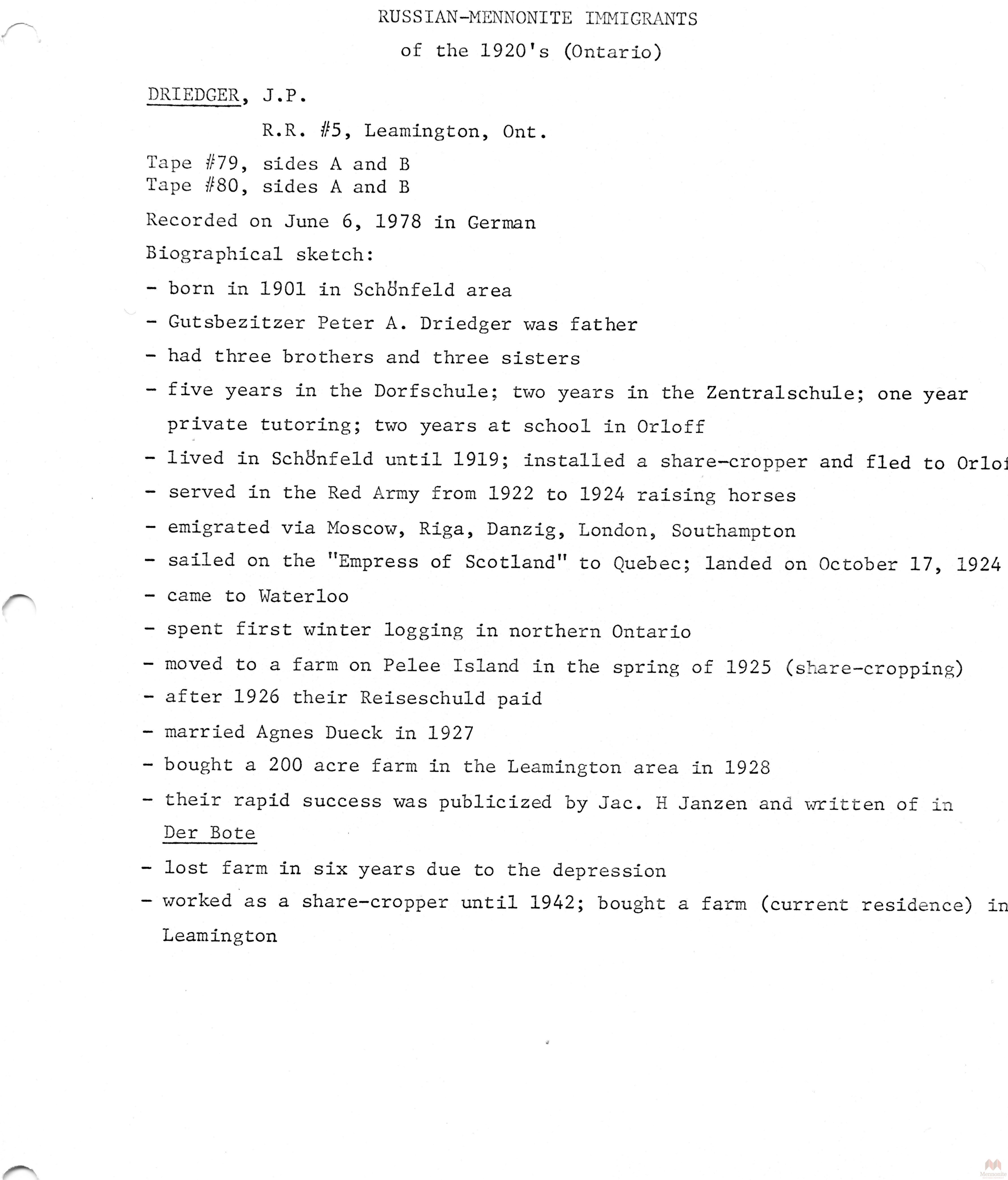 Keywords Mennonite, Russia, Russian, emigration, interview, oral, history, immigration, immigrants, Canada, Ontario, 1920s, transcript, biography, J.P. Driedger,