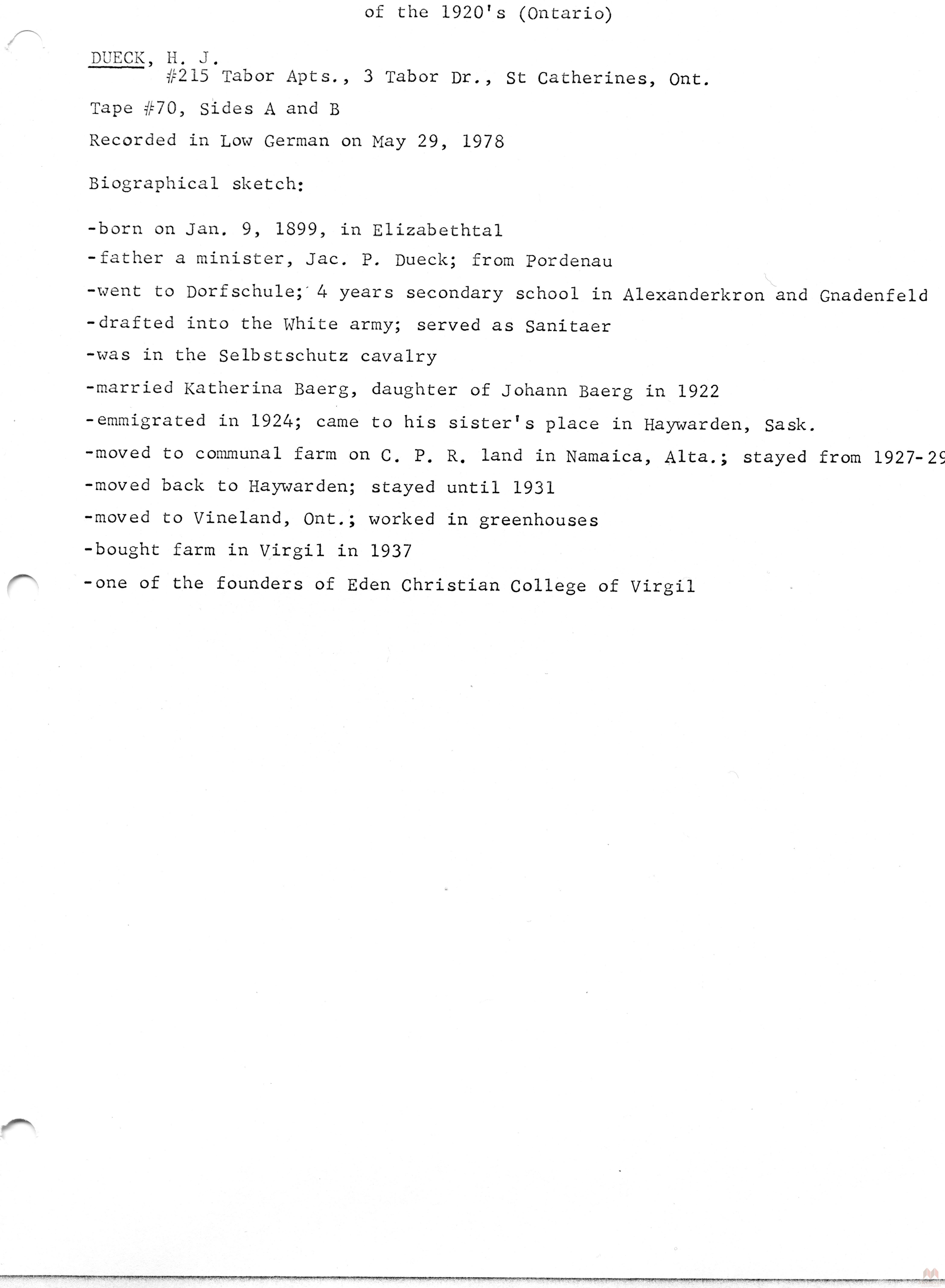 Keywords Mennonite, Russia, Russian, emigration, interview, oral, history, immigration, immigrants, Canada, Ontario, 1920s, transcript, biography, H.J. Dueck,