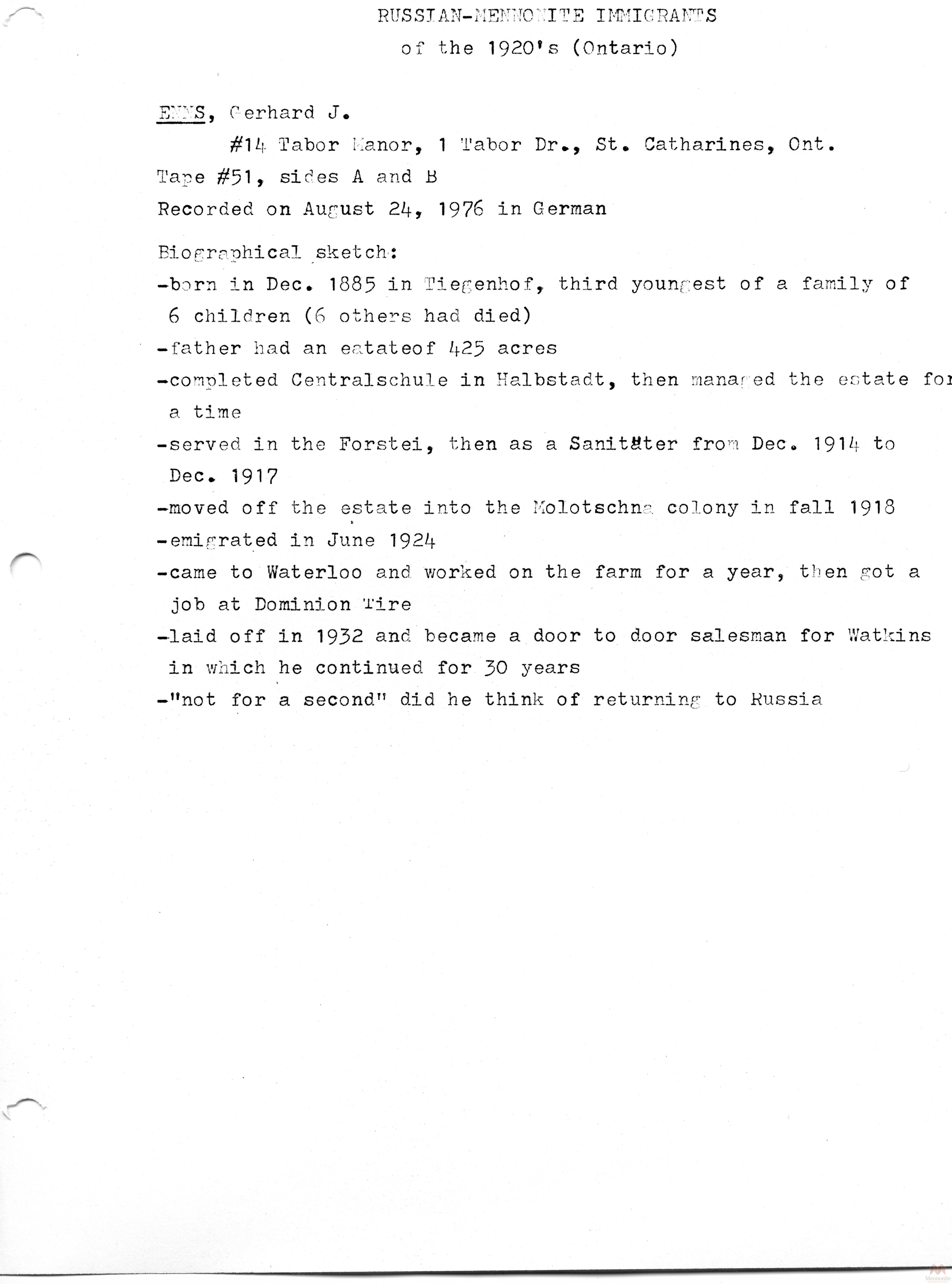 Keywords Mennonite, Russia, Russian, emigration, interview, oral, history, immigration, immigrants, Canada, Ontario, 1920s, transcript, biography, Gerhard J. Enns,