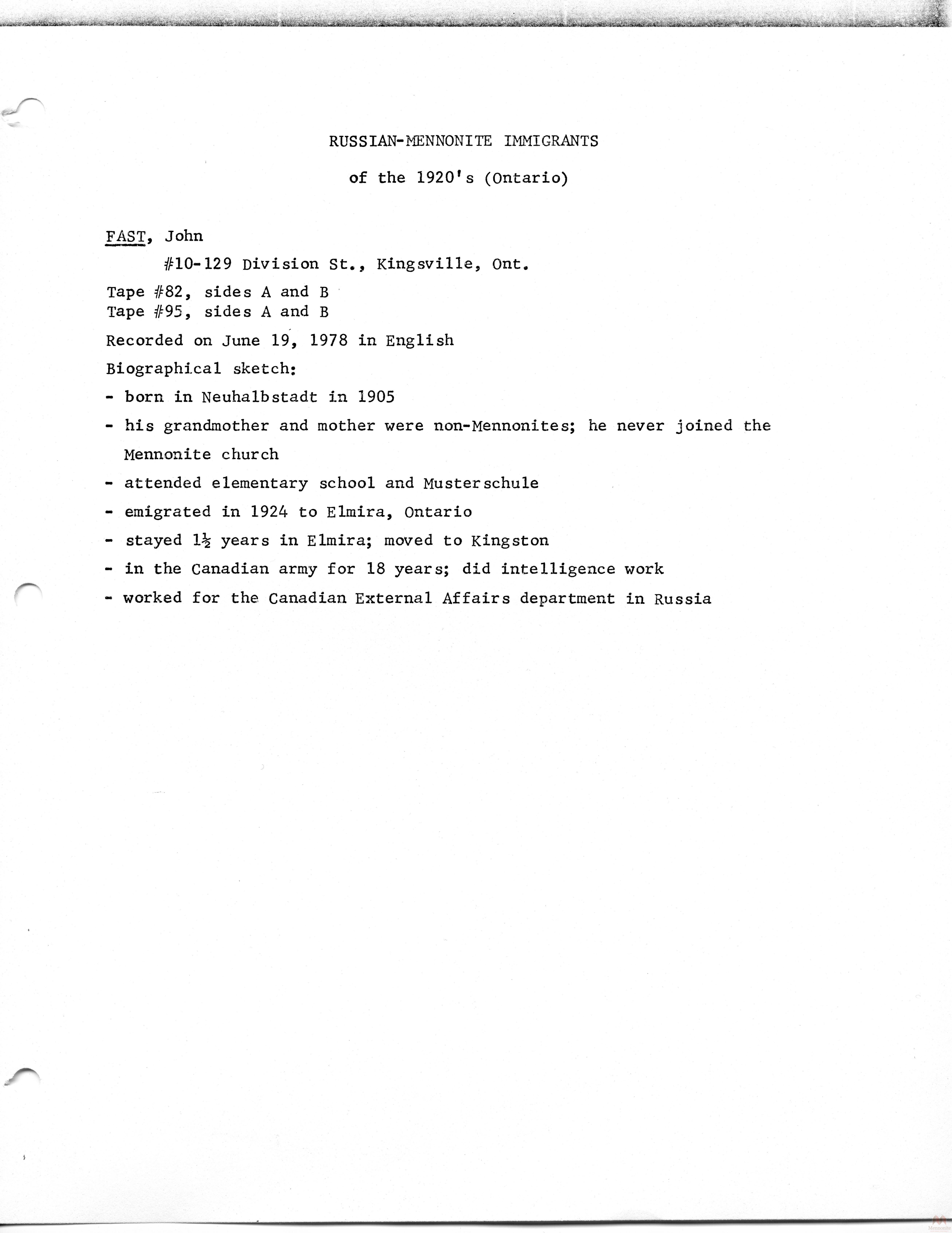 Keywords Mennonite, Russia, Russian, emigration, interview, oral, history, immigration, immigrants, Canada, Ontario, 1920s, transcript, biography, John Fast,
