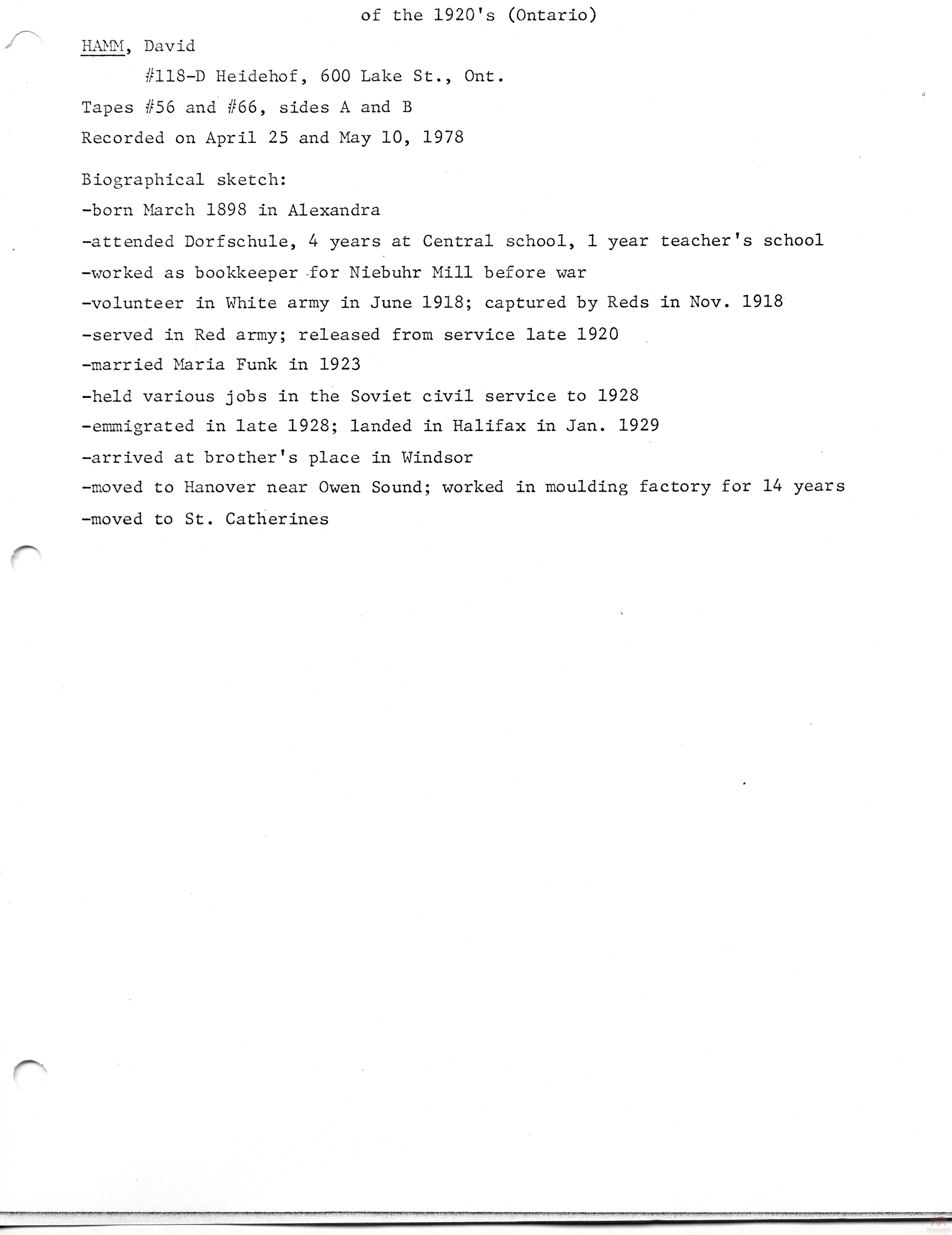 Keywords Mennonite, Russia, Russian, emigration, interview, oral, history, immigration, immigrants, Canada, Ontario, 1920s, transcript, biography, David Hamm,
