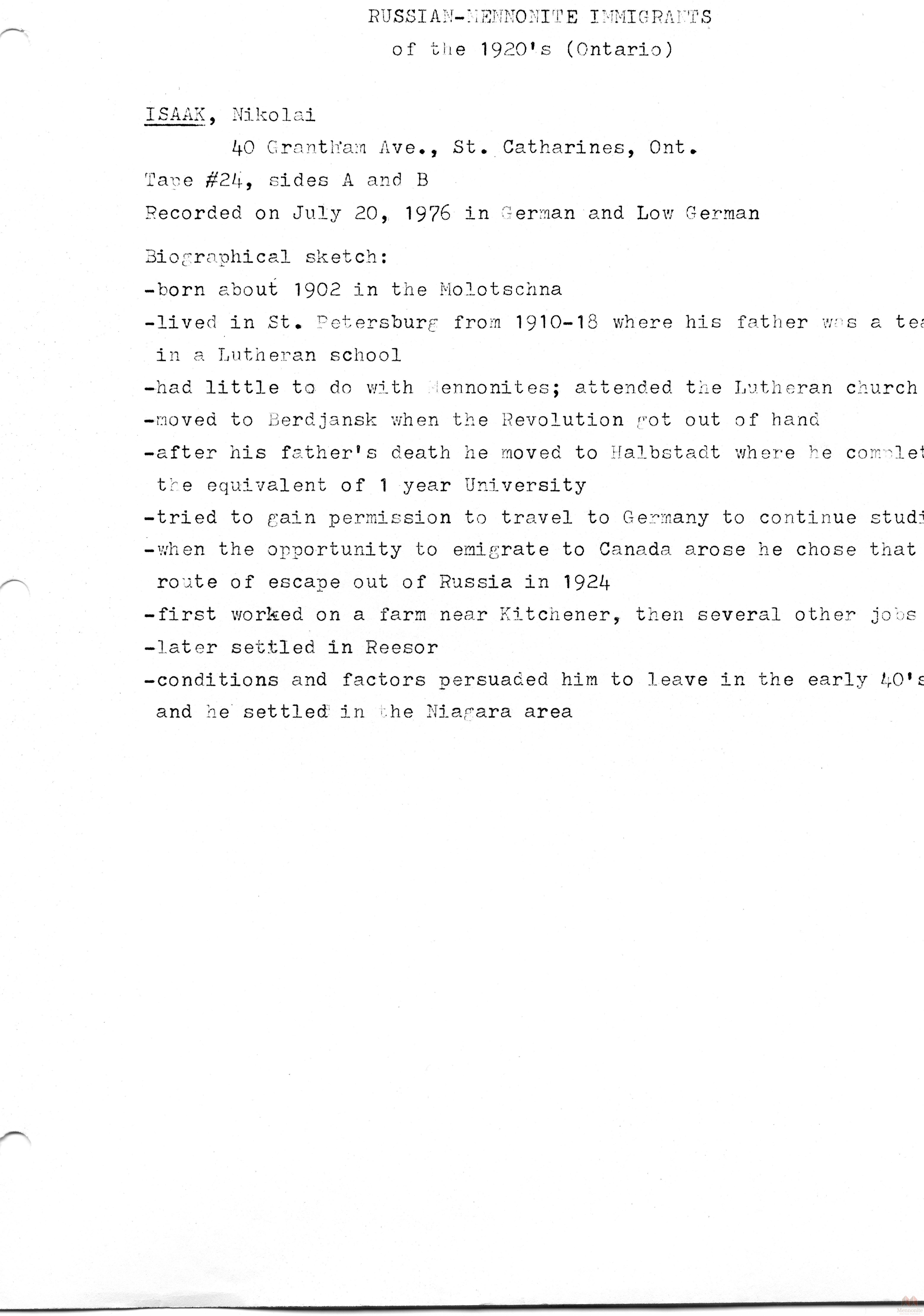 Keywords Mennonite, Russia, Russian, emigration, interview, oral, history, immigration, immigrants, Canada, Ontario, 1920s, transcript, biography, Isaak Nikolni,