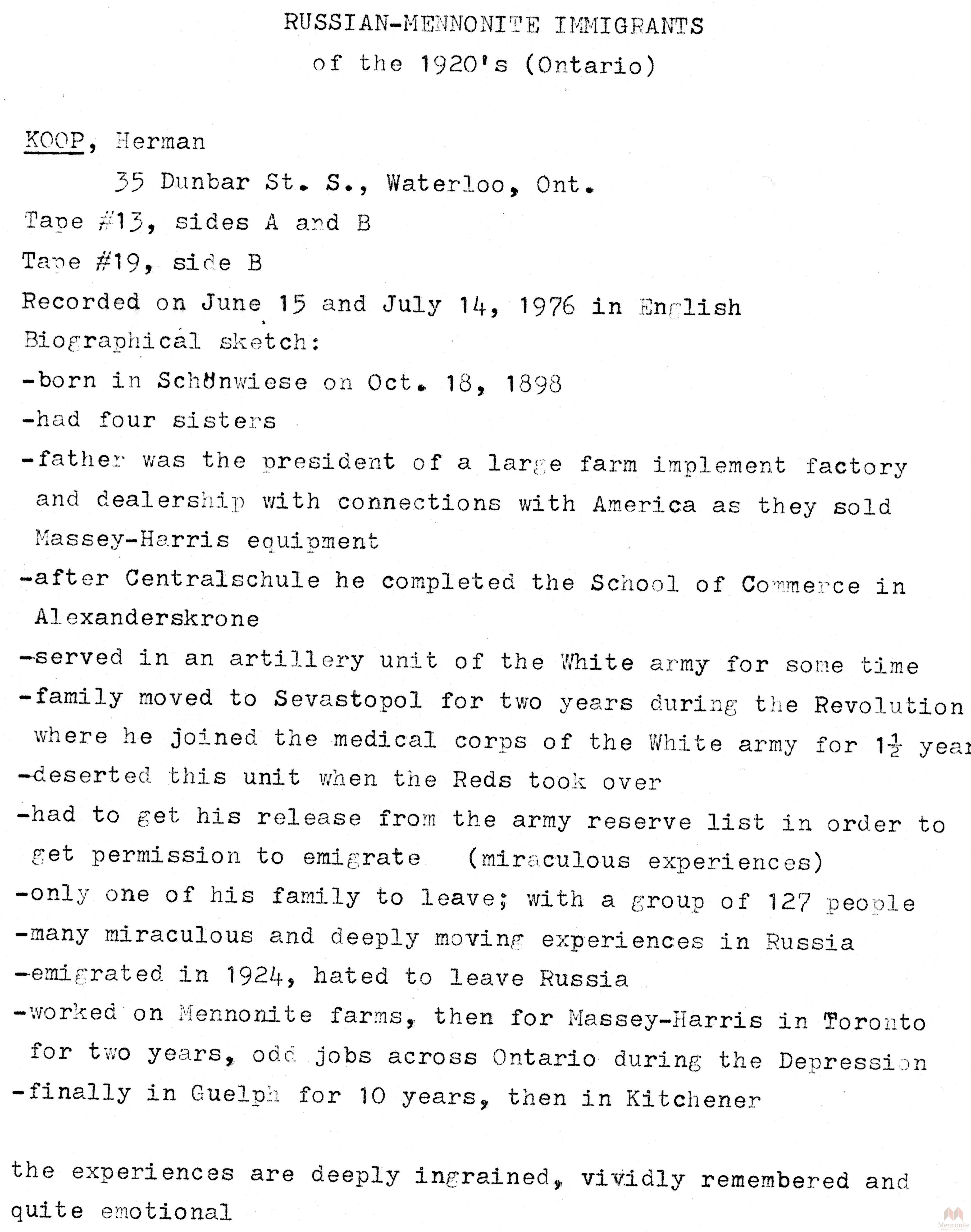 Keywords Mennonite, Russia, Russian, emigration, interview, oral, history, immigration, immigrants, Canada, Ontario, 1920s, transcript, biography, Herman Koop,