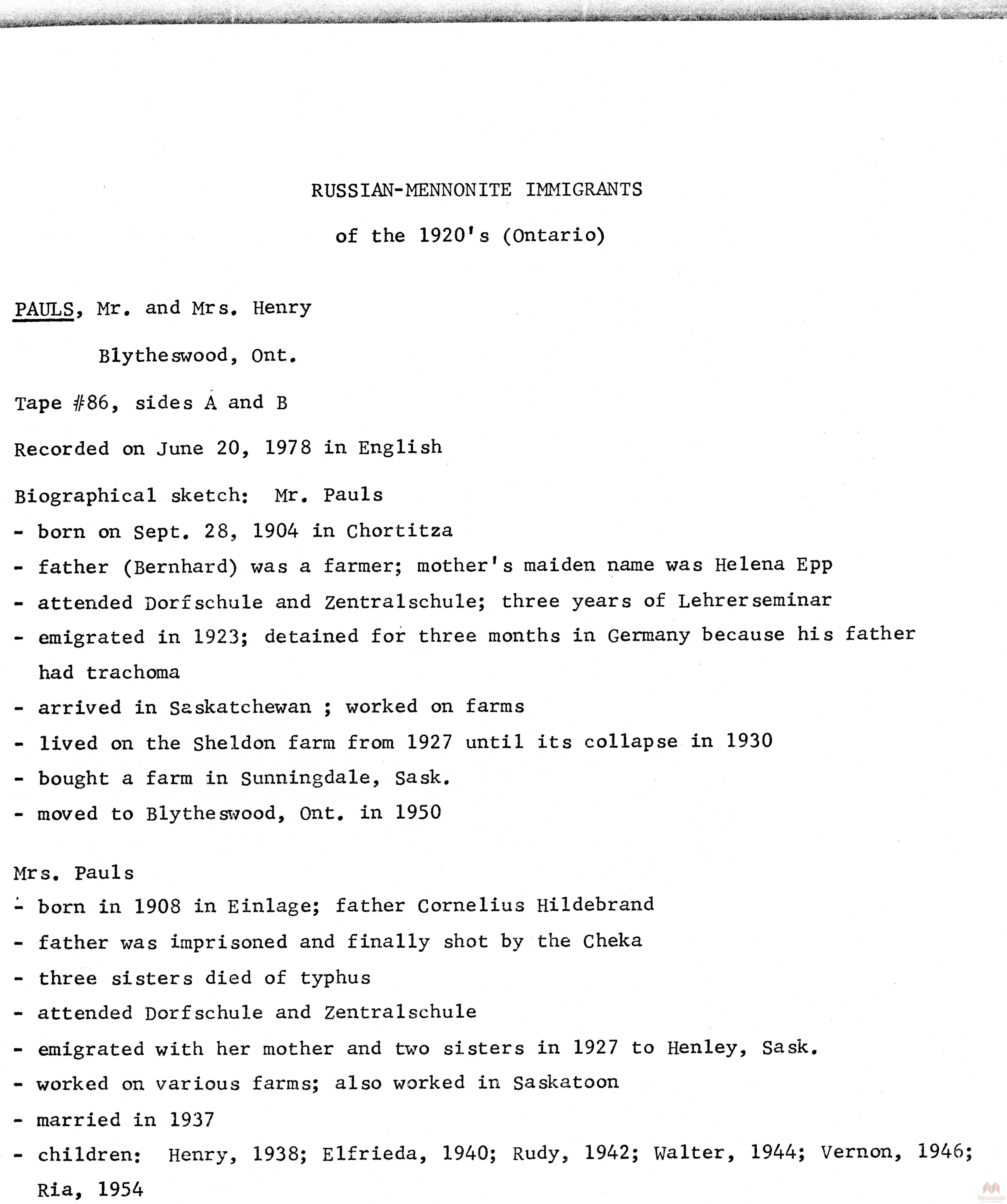 Keywords Mennonite, Russia, Russian, emigration, interview, oral, history, immigration, immigrants, Canada, Ontario, 1920s, transcript, biography, Henry Pauls, Mrs. Henry Pauls,