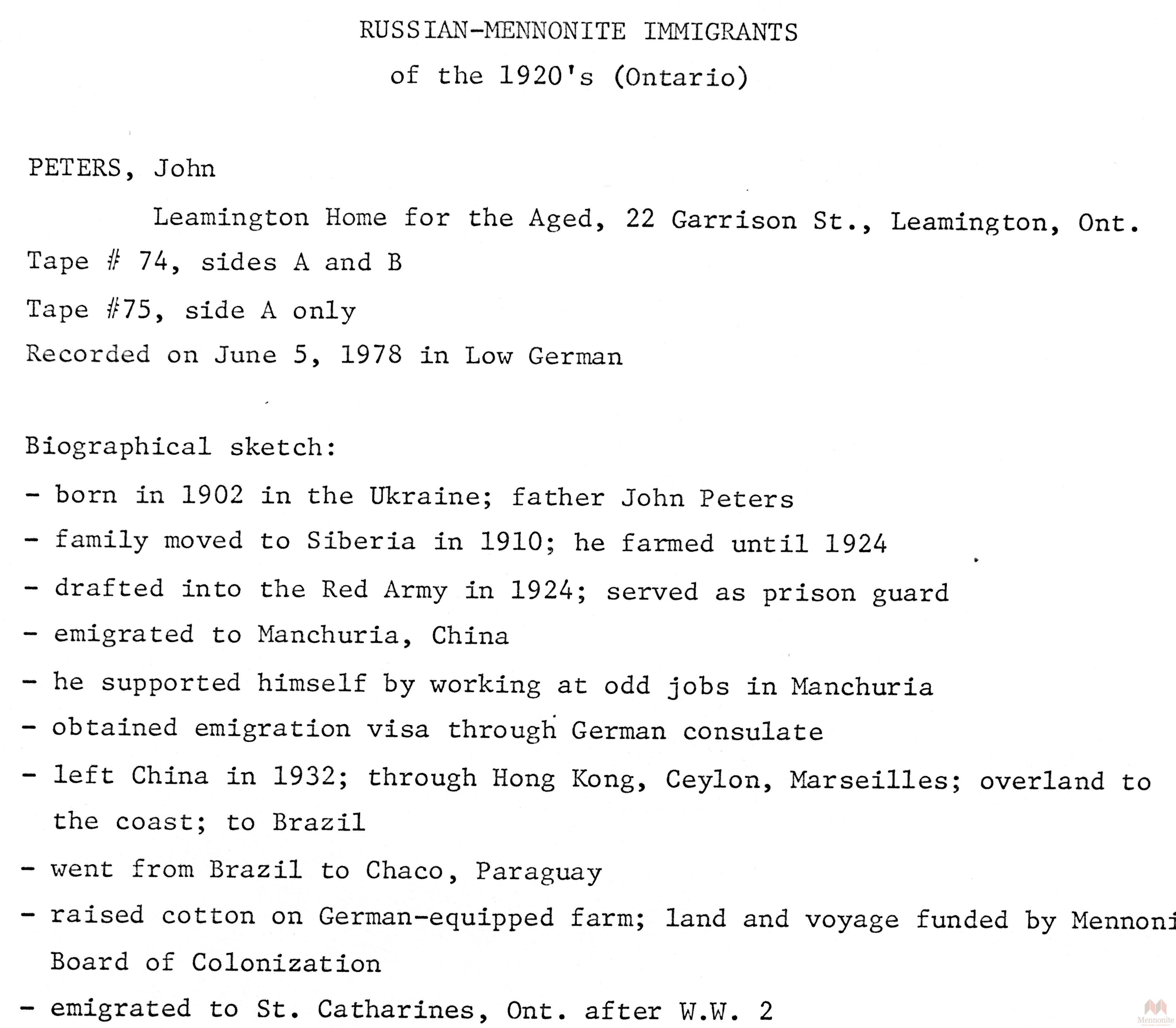 Keywords Mennonite, Russia, Russian, emigration, interview, oral, history, immigration, immigrants, Canada, Ontario, 1920s, transcript, biography, John Peters,
