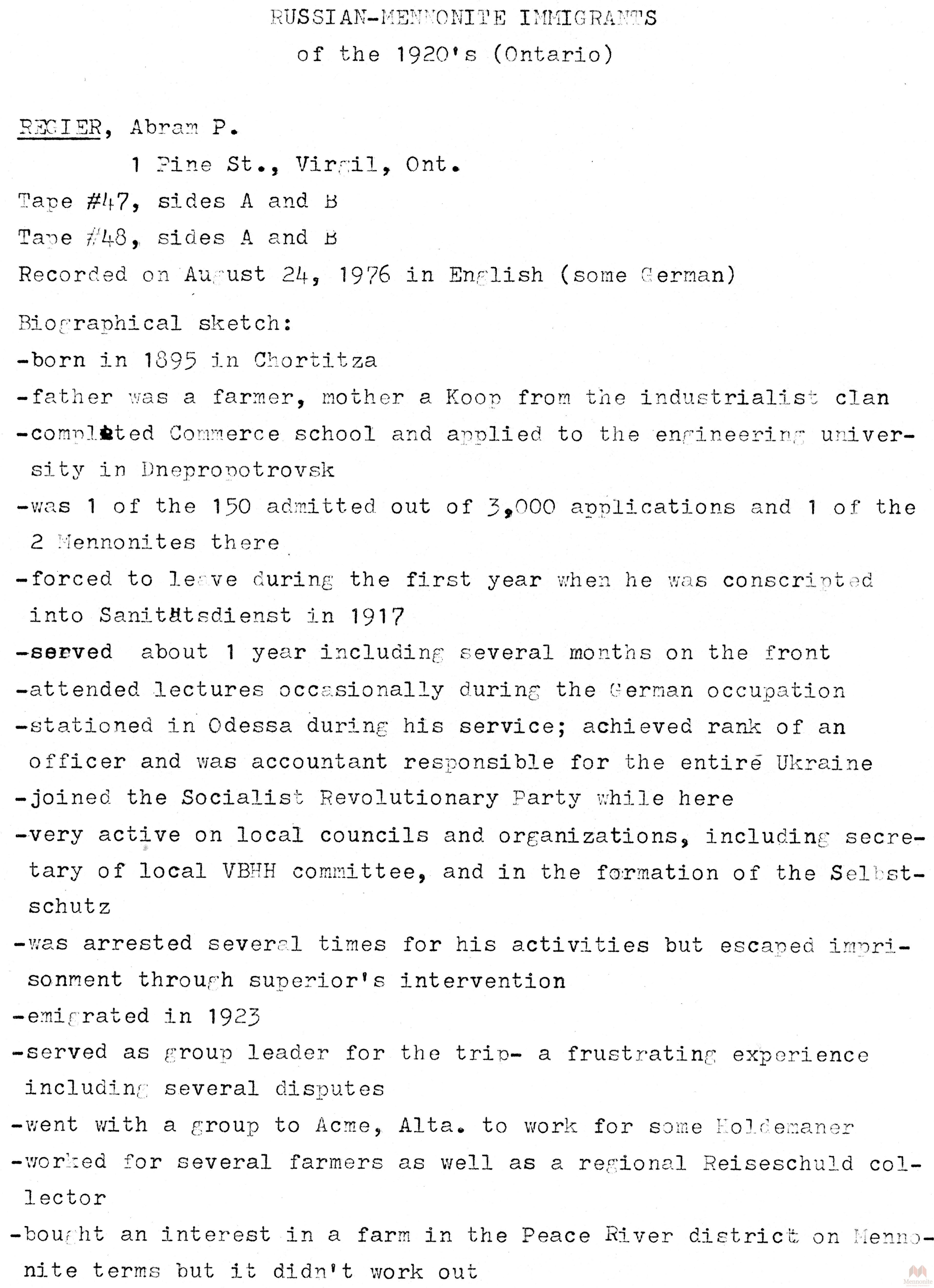 Keywords Mennonite, Russia, Russian, emigration, interview, oral, history, immigration, immigrants, Canada, Ontario, 1920s, transcript, biography, Abram P. Regier,