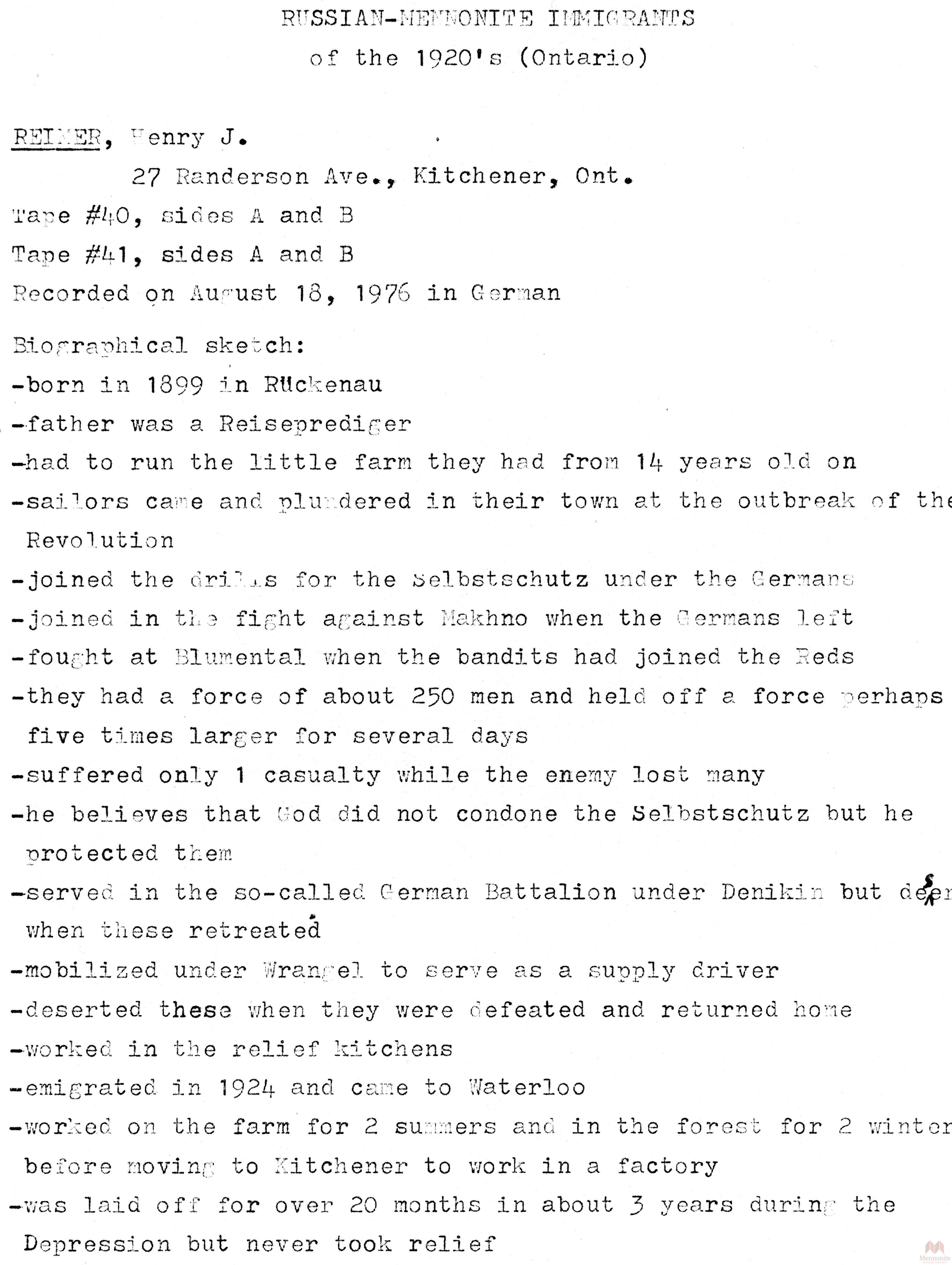 Keywords Mennonite, Russia, Russian, emigration, interview, oral, history, immigration, immigrants, Canada, Ontario, 1920s, transcript, biography, Henry J. Regehr,