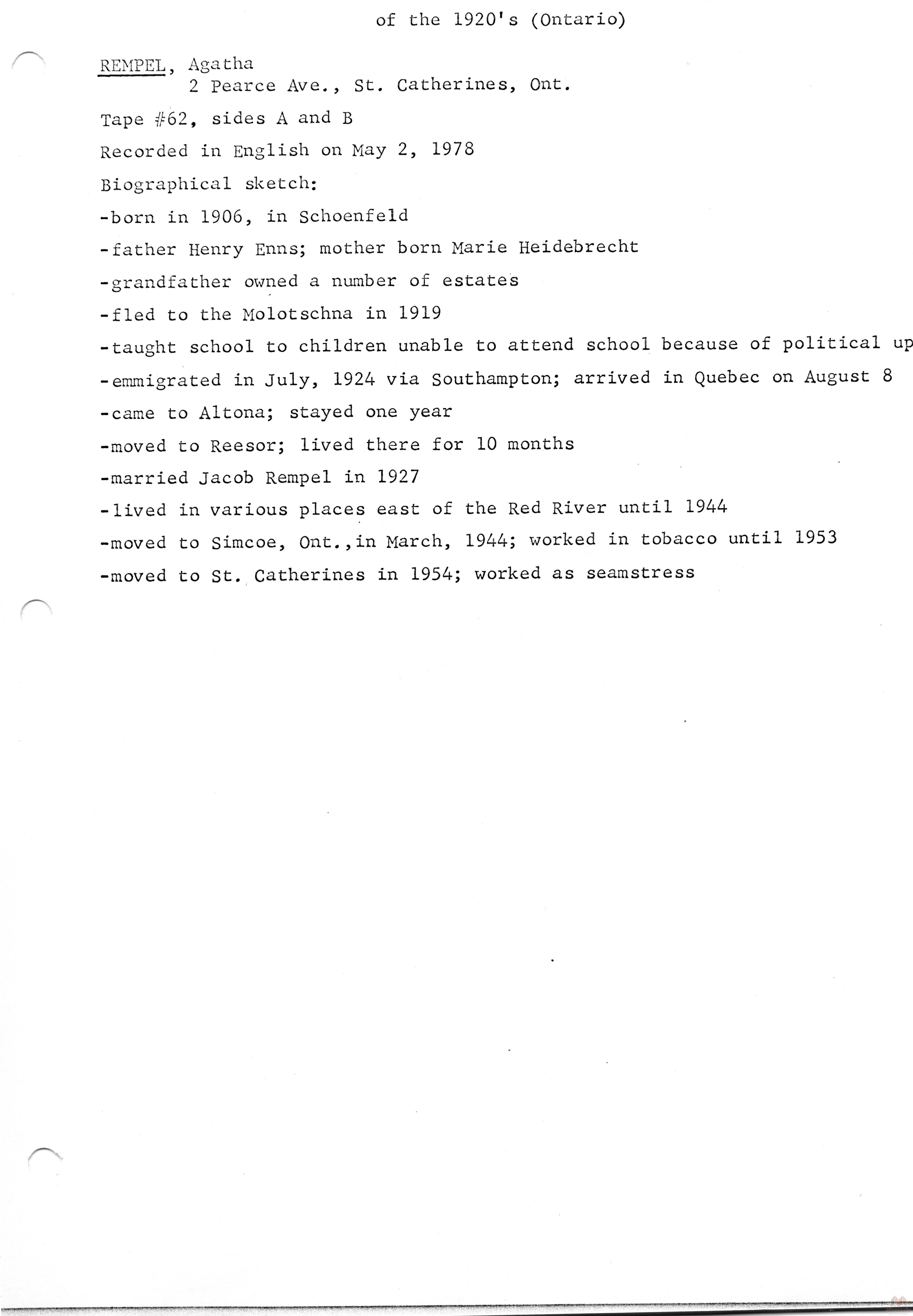 Keywords Mennonite, Russia, Russian, emigration, interview, oral, history, immigration, immigrants, Canada, Ontario, 1920s, transcript, biography, Agatha Rempel,