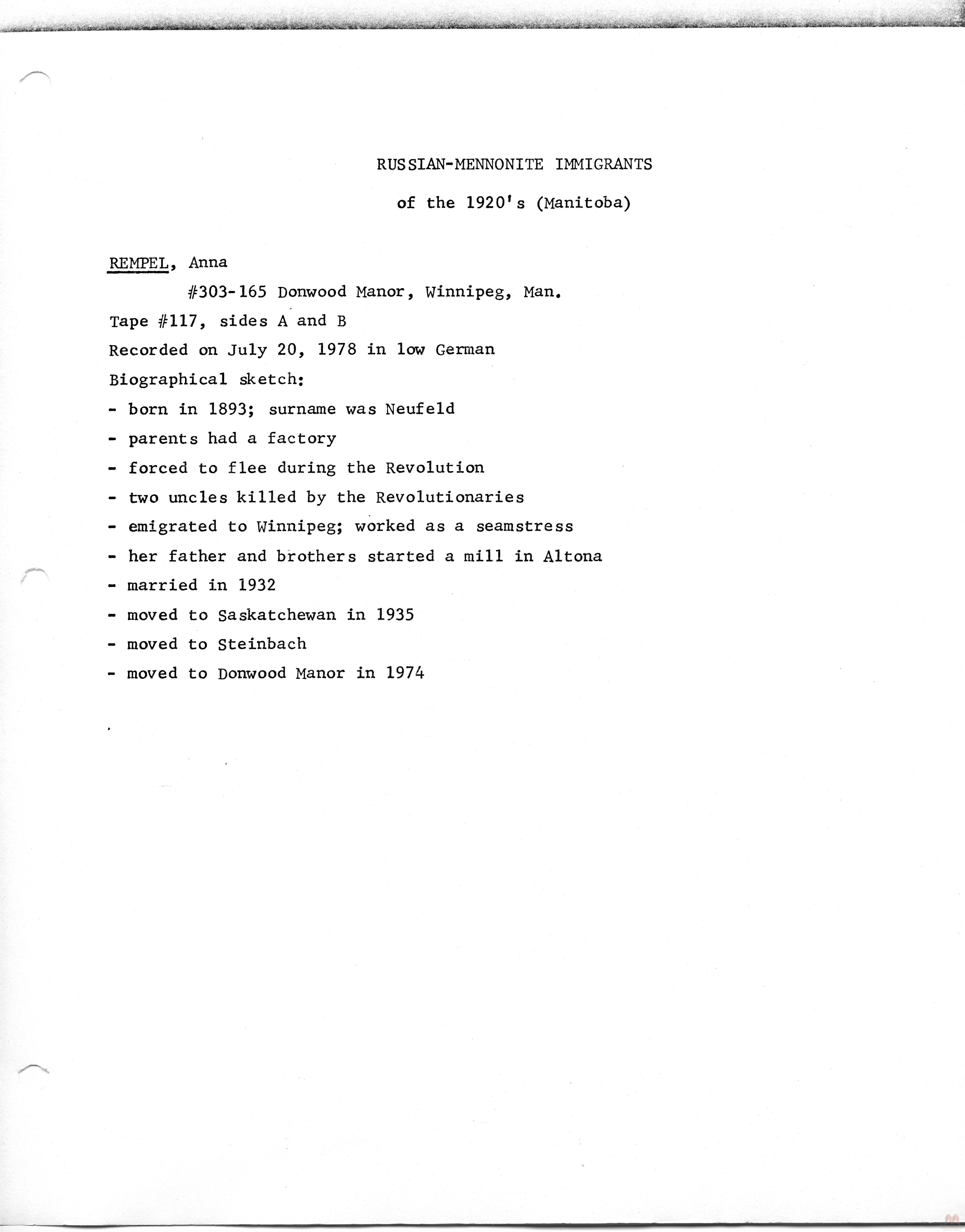 Keywords Mennonite, Russia, Russian, emigration, interview, oral, history, immigration, immigrants, Canada, Ontario, 1920s, transcript, biography, Anna Rempel,