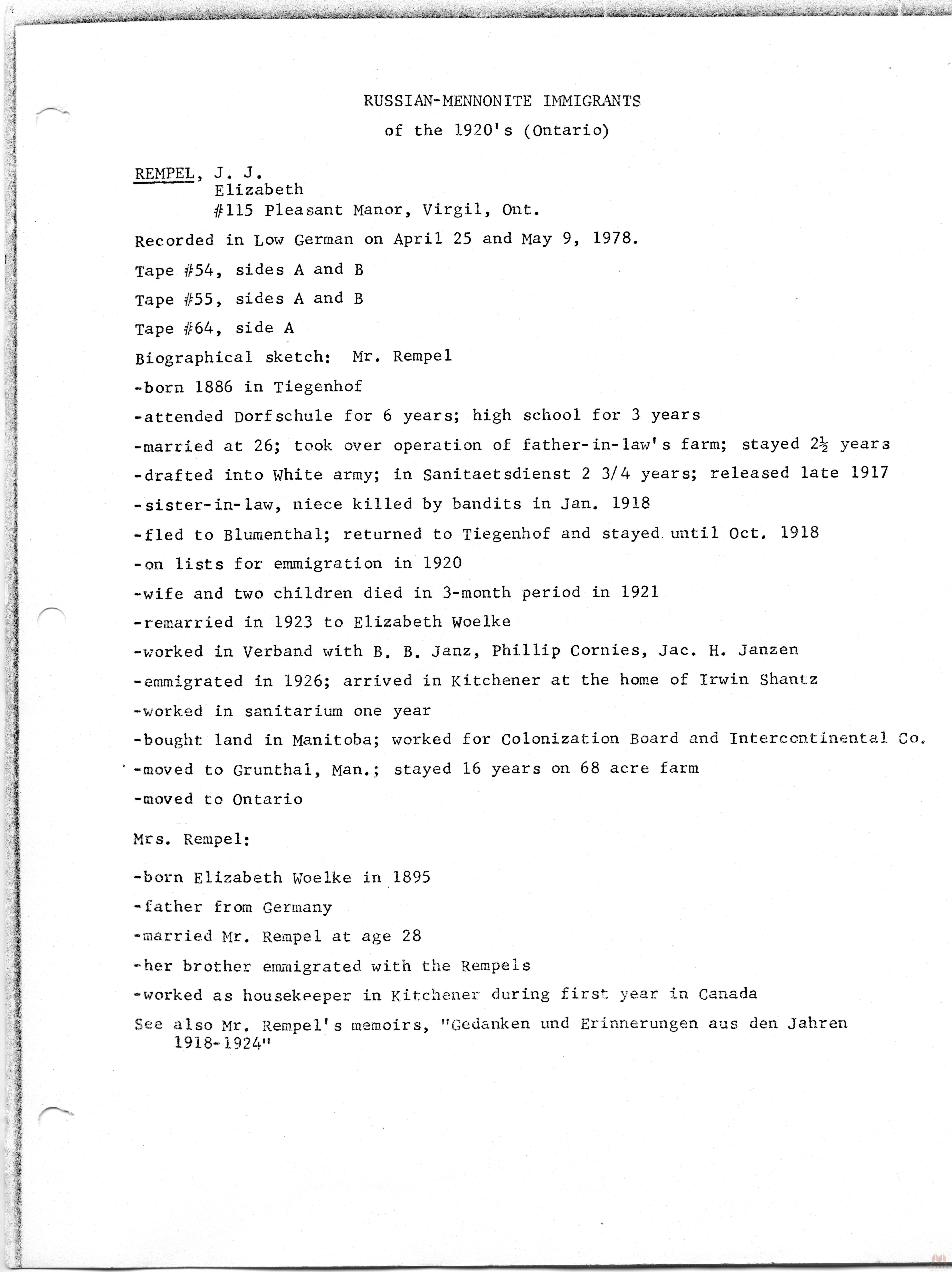 Keywords Mennonite, Russia, Russian, emigration, interview, oral, history, immigration, immigrants, Canada, Ontario, 1920s, transcript, biography, Elizabeth Rempel, J.J. Rempel,
