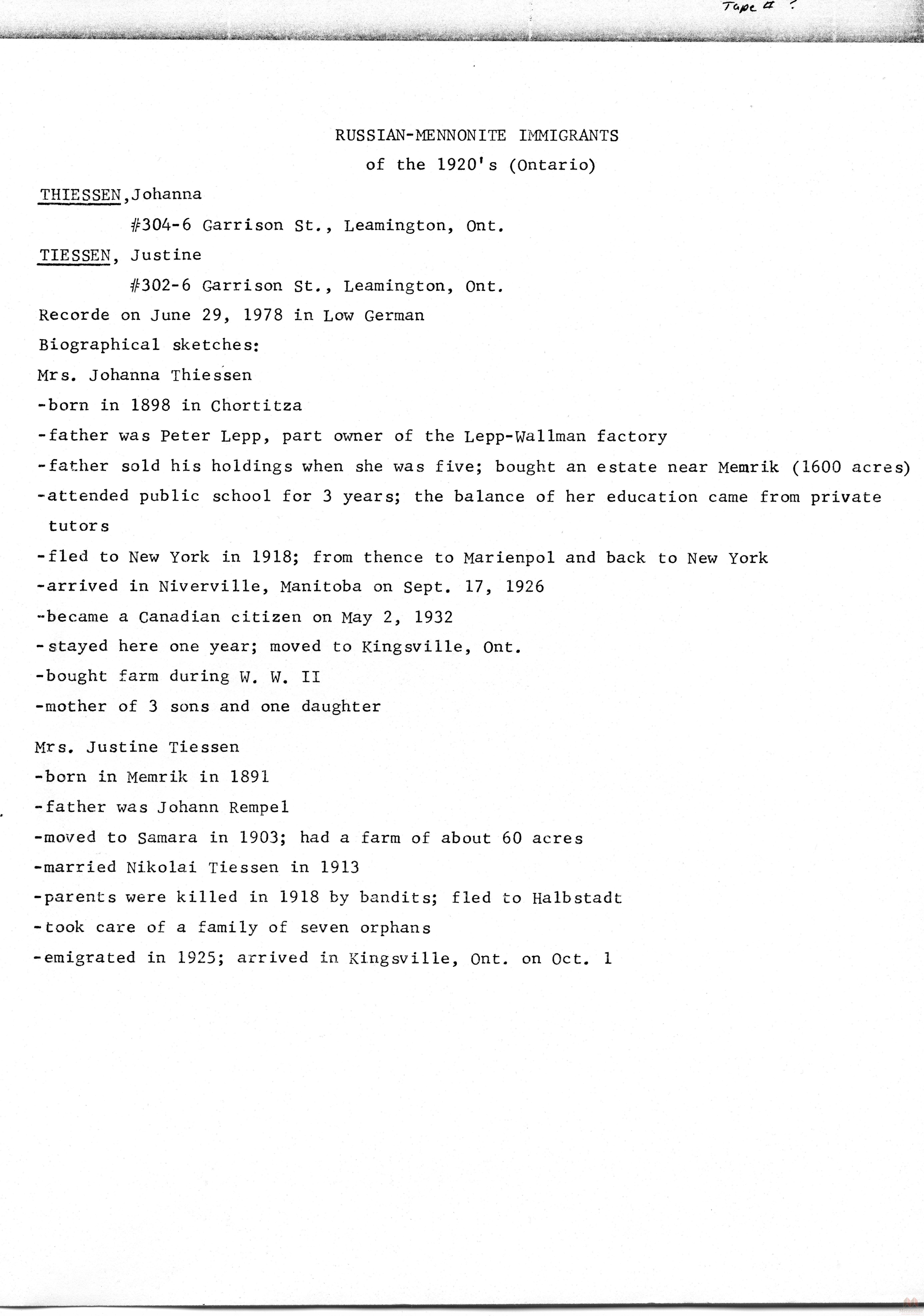 From the collection:Finding Aid #1 - Oral History - Russian Mennonite Migration - 1920's