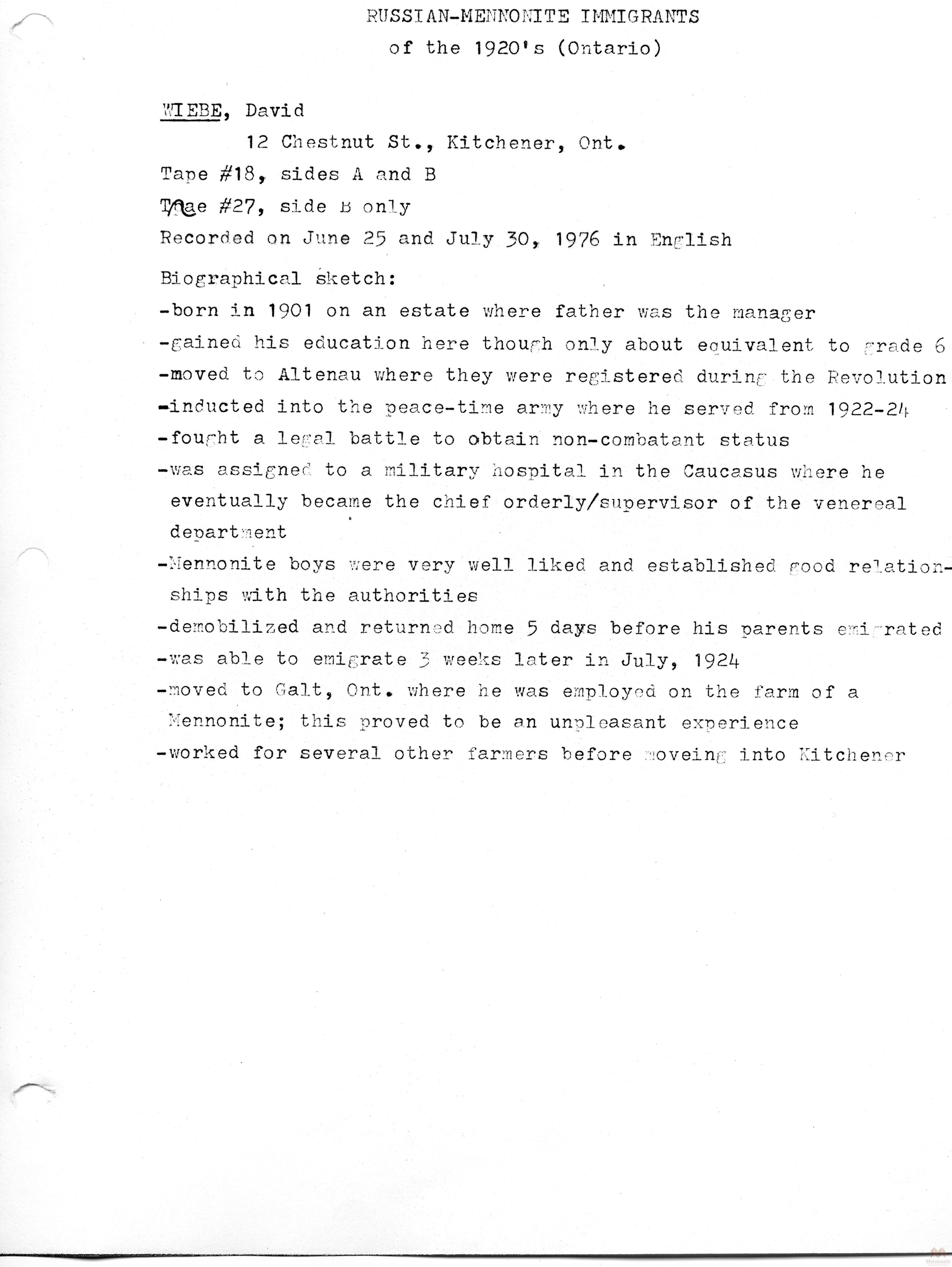 Keywords Mennonite, Russia, Russian, emigration, interview, oral, history, immigration, immigrants, Canada, Ontario, 1920s, transcript, biography, David Wiebe,