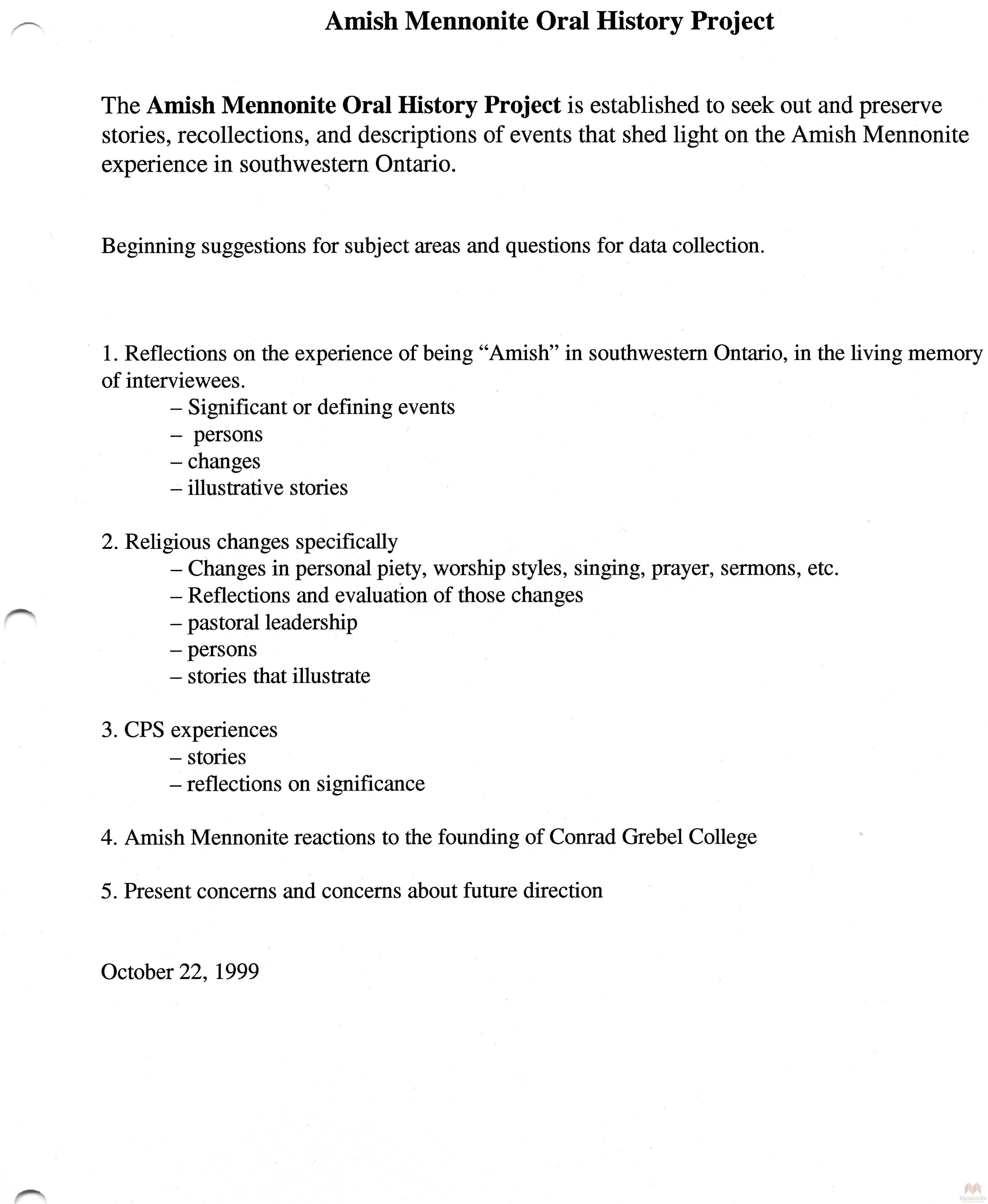Hist.Mss.22.7 Oral History, Amish Mennonite Experience in Ontario - Summeries & Releases