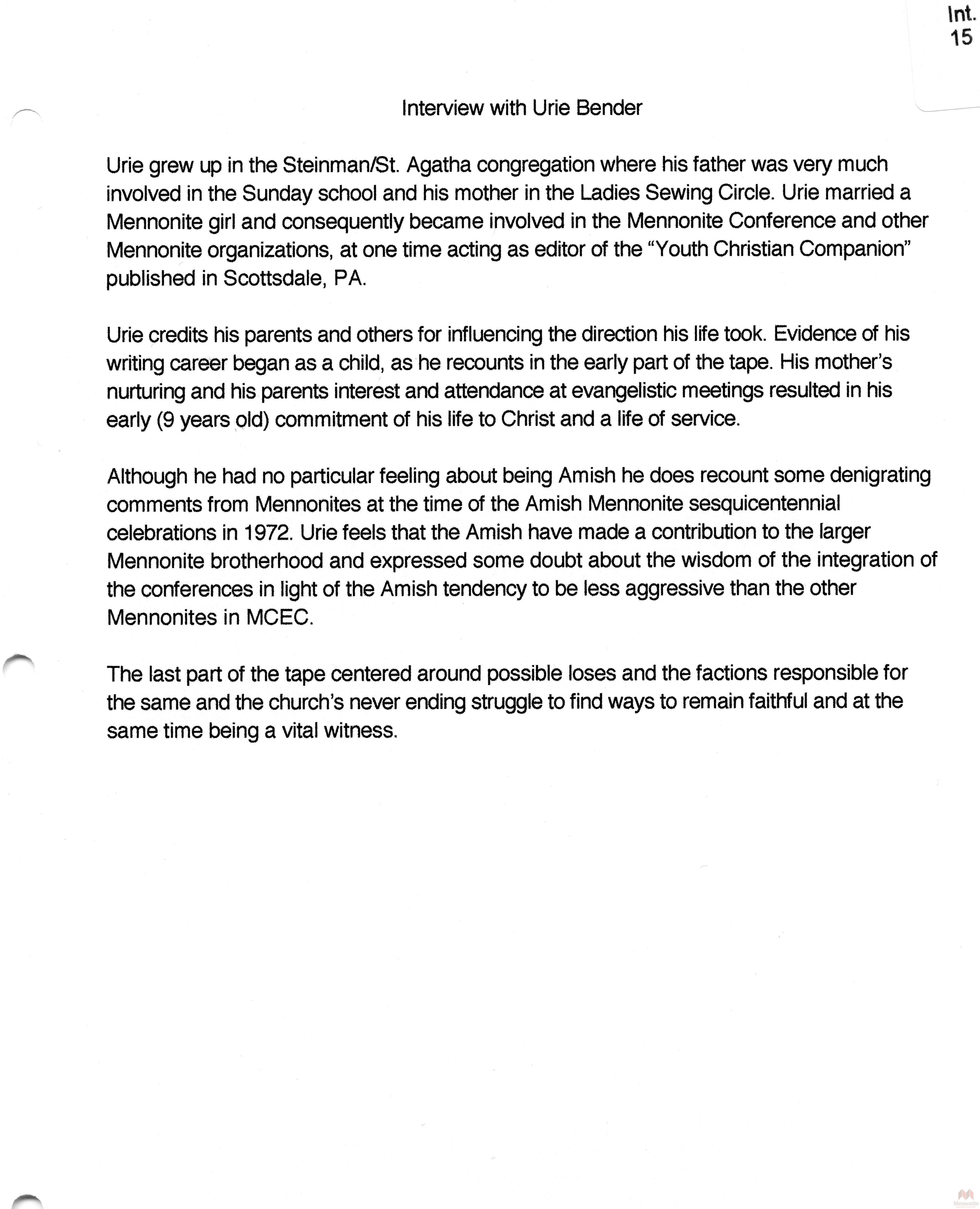 Keywords Urie Bender, Hist.Mss.22.7, Oral, History, Amish, Mennonite, Ontario, Summaries, Releases, stories, recollections, Southwestern Ontario, Amish Mennonite Oral History Project, Conrad Grebel College,
