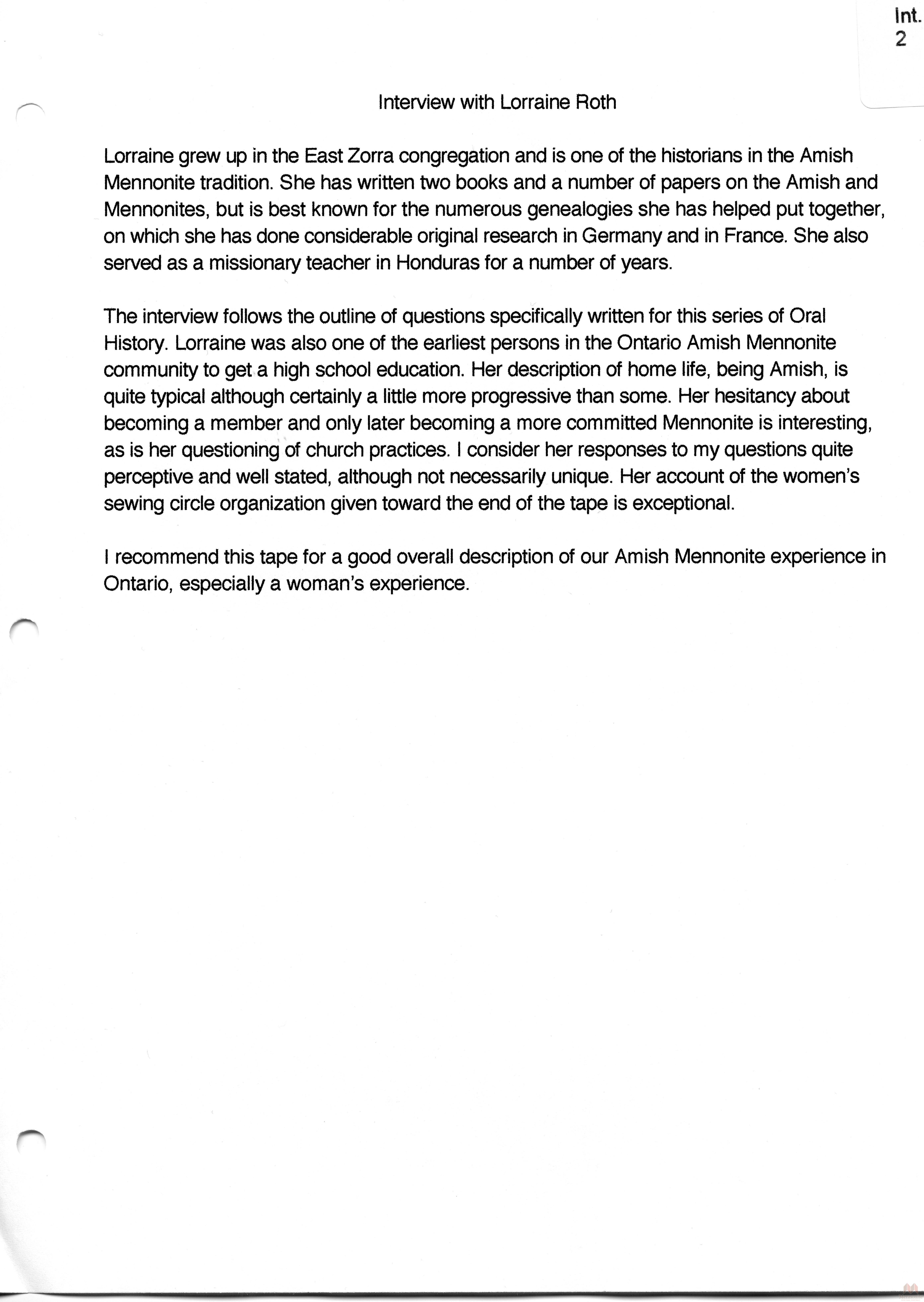 Keywords Lorraine Roth, Hist.Mss.22.7, Oral, History, Amish, Mennonite, Ontario, Summaries, Releases, stories, recollections, Southwestern Ontario, Amish Mennonite Oral History Project, Conrad Grebel College,