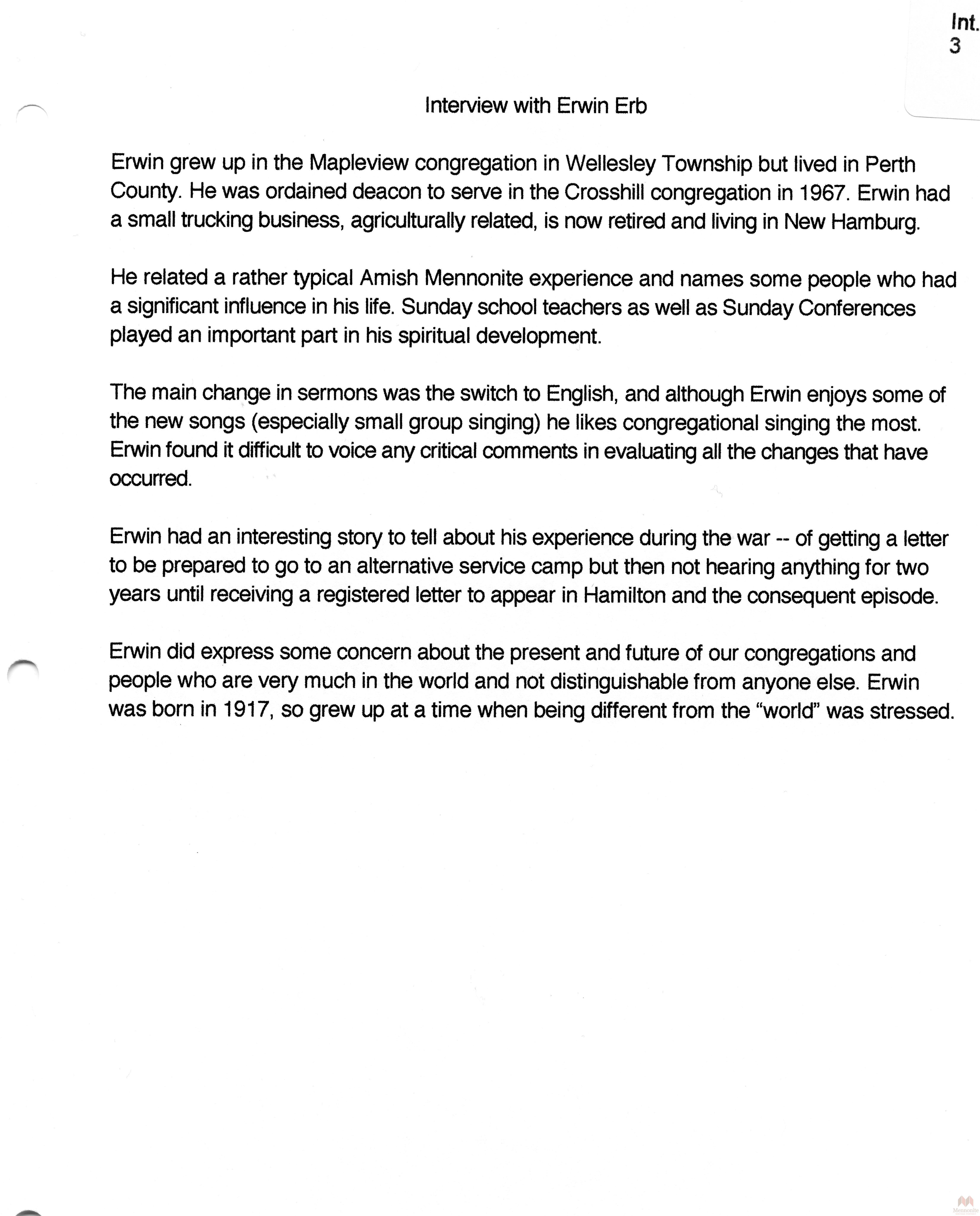 Keywords Erwin Erb, Hist.Mss.22.7, Oral, History, Amish, Mennonite, Ontario, Summaries, Releases, stories, recollections, Southwestern Ontario, Amish Mennonite Oral History Project, Conrad Grebel College,