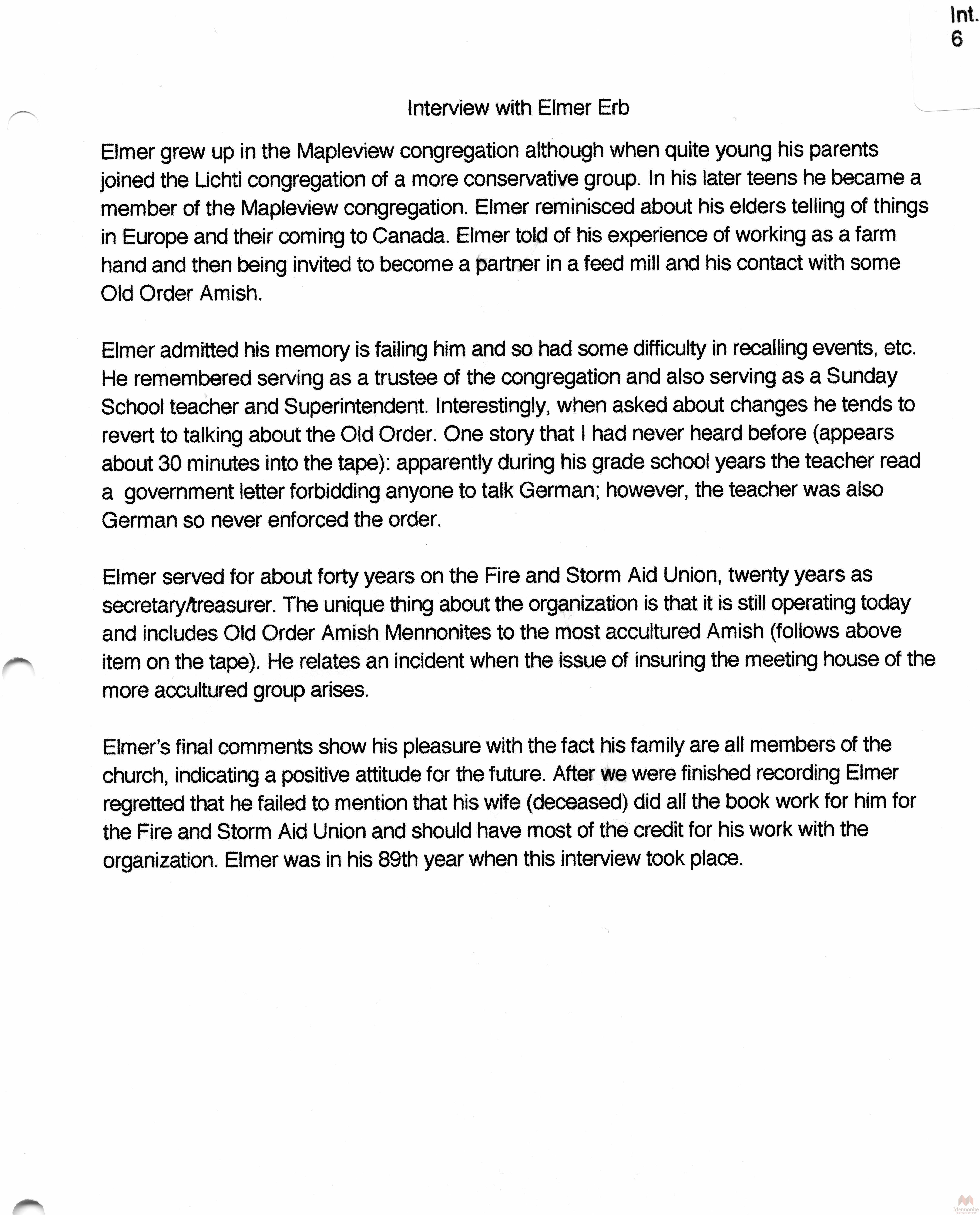 Keywords Elmer Erb, Hist.Mss.22.7, Oral, History, Amish, Mennonite, Ontario, Summaries, Releases, stories, recollections, Southwestern Ontario, Amish Mennonite Oral History Project, Conrad Grebel College,