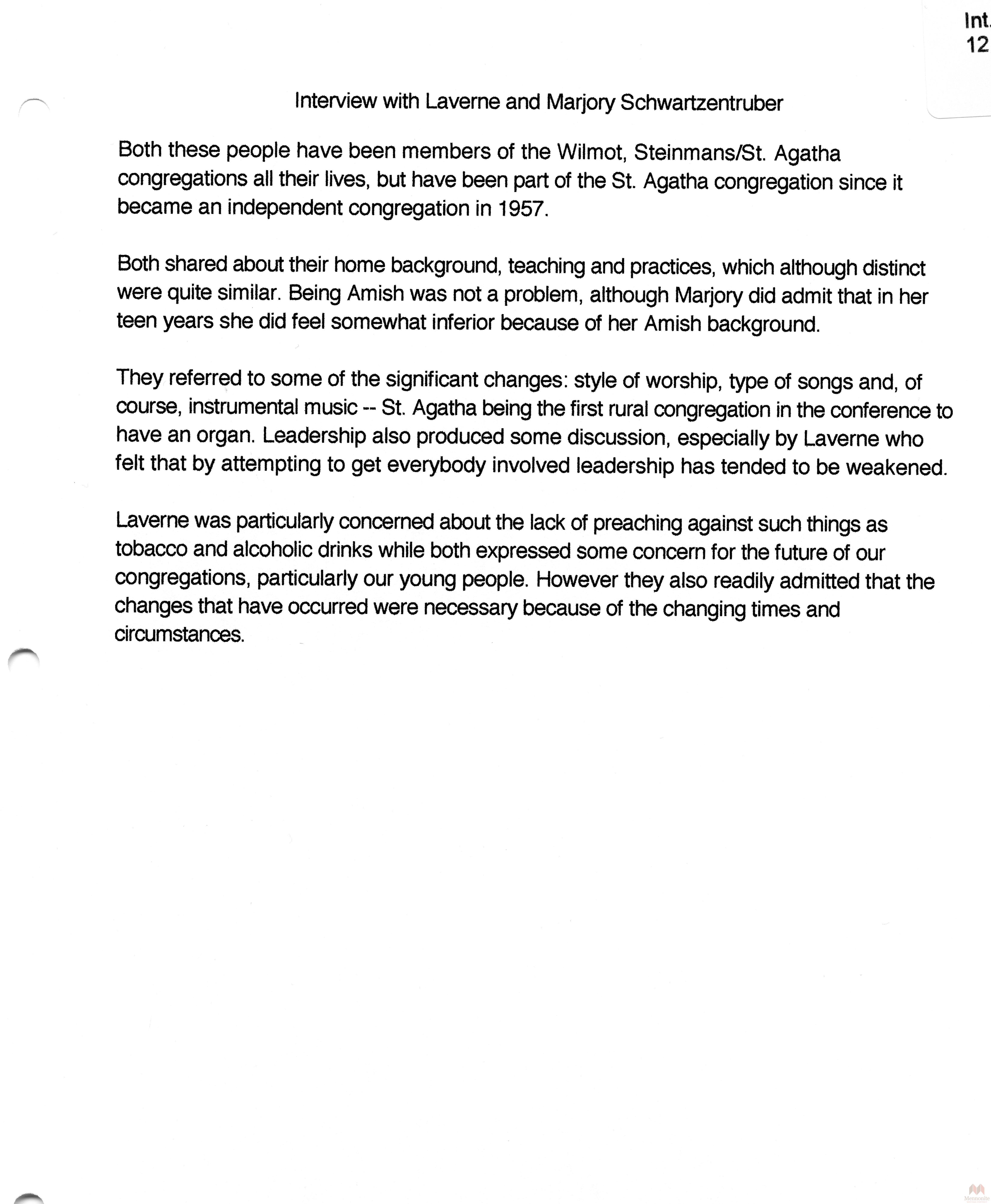 Keywords Hist.Mss.22.7, Oral, History, Amish, Mennonite, Ontario, Summaries, Releases, stories, recollections, Southwestern Ontario, Amish Mennonite Oral History Project, Conrad Grebel College, Lavrene Schwartzentruber, Marjory Schwartzentruber,