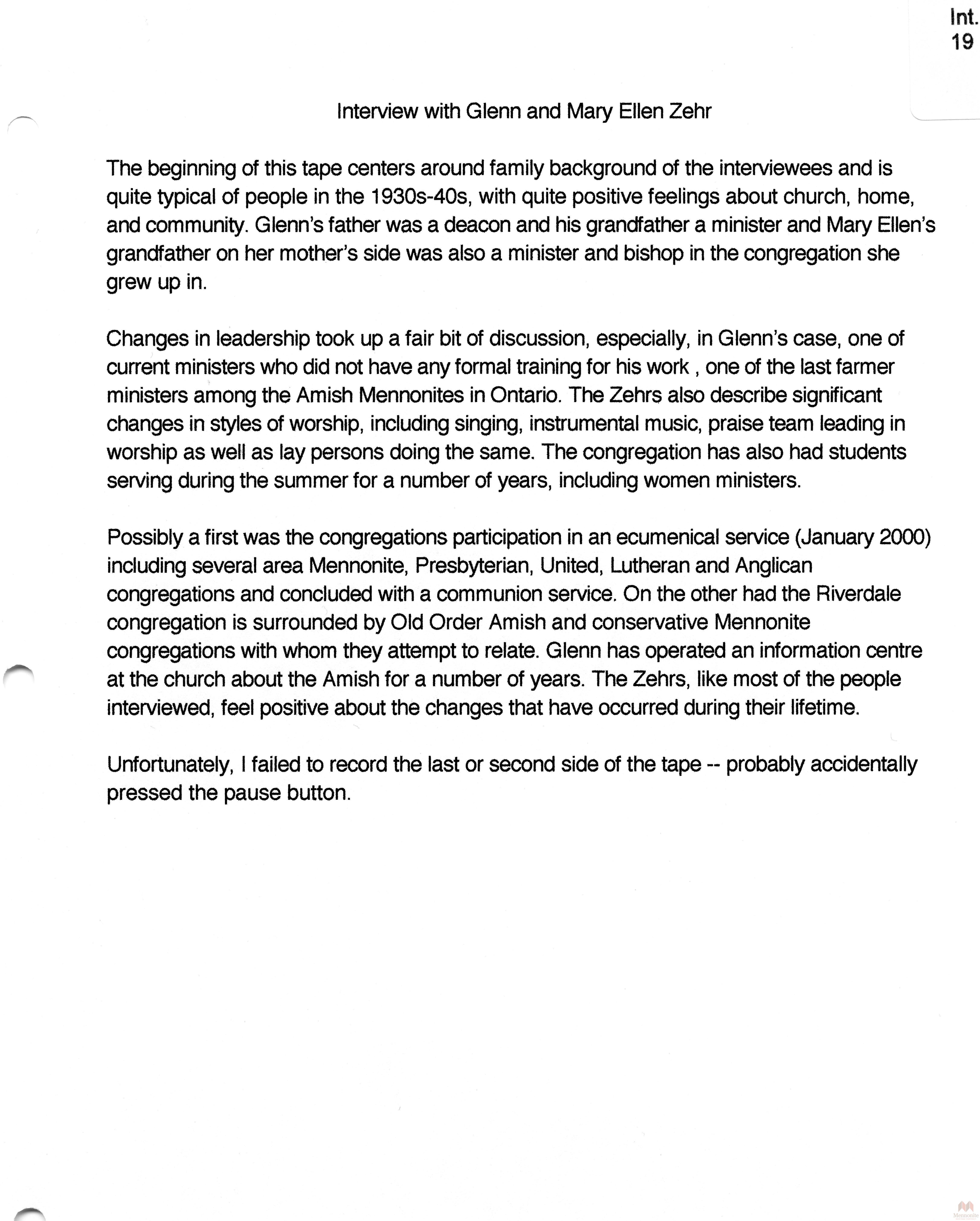Keywords Hist.Mss.22.7, Oral, History, Amish, Mennonite, Ontario, Summaries, Releases, stories, recollections, Southwestern Ontario, Amish Mennonite Oral History Project, Conrad Grebel College, Glenn Zehr, Mary Ellen Zehr,