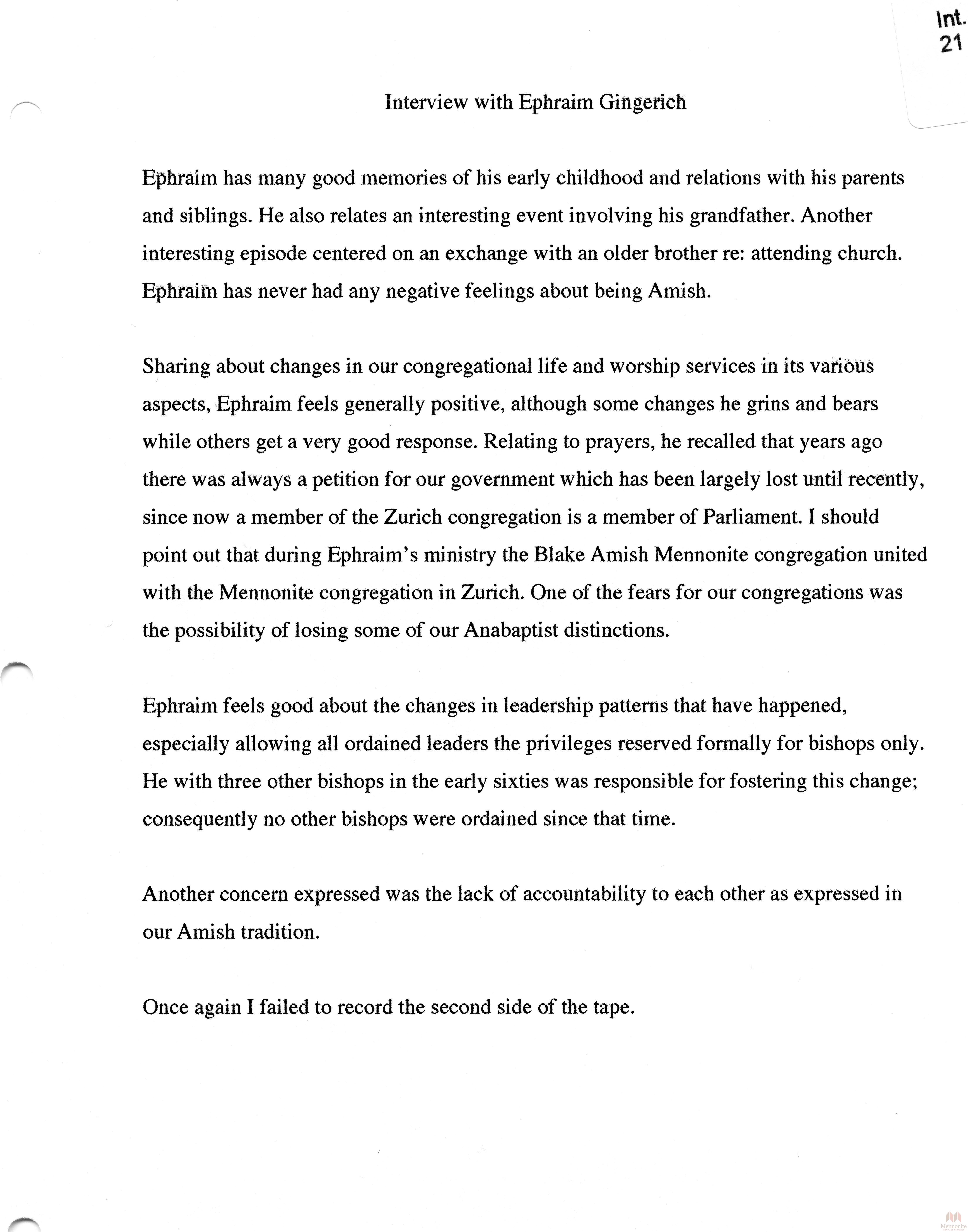 Keywords Ephraim Gingerich, Hist.Mss.22.7, Oral, History, Amish, Mennonite, Ontario, Summaries, Releases, stories, recollections, Southwestern Ontario, Amish Mennonite Oral History Project, Conrad Grebel College,