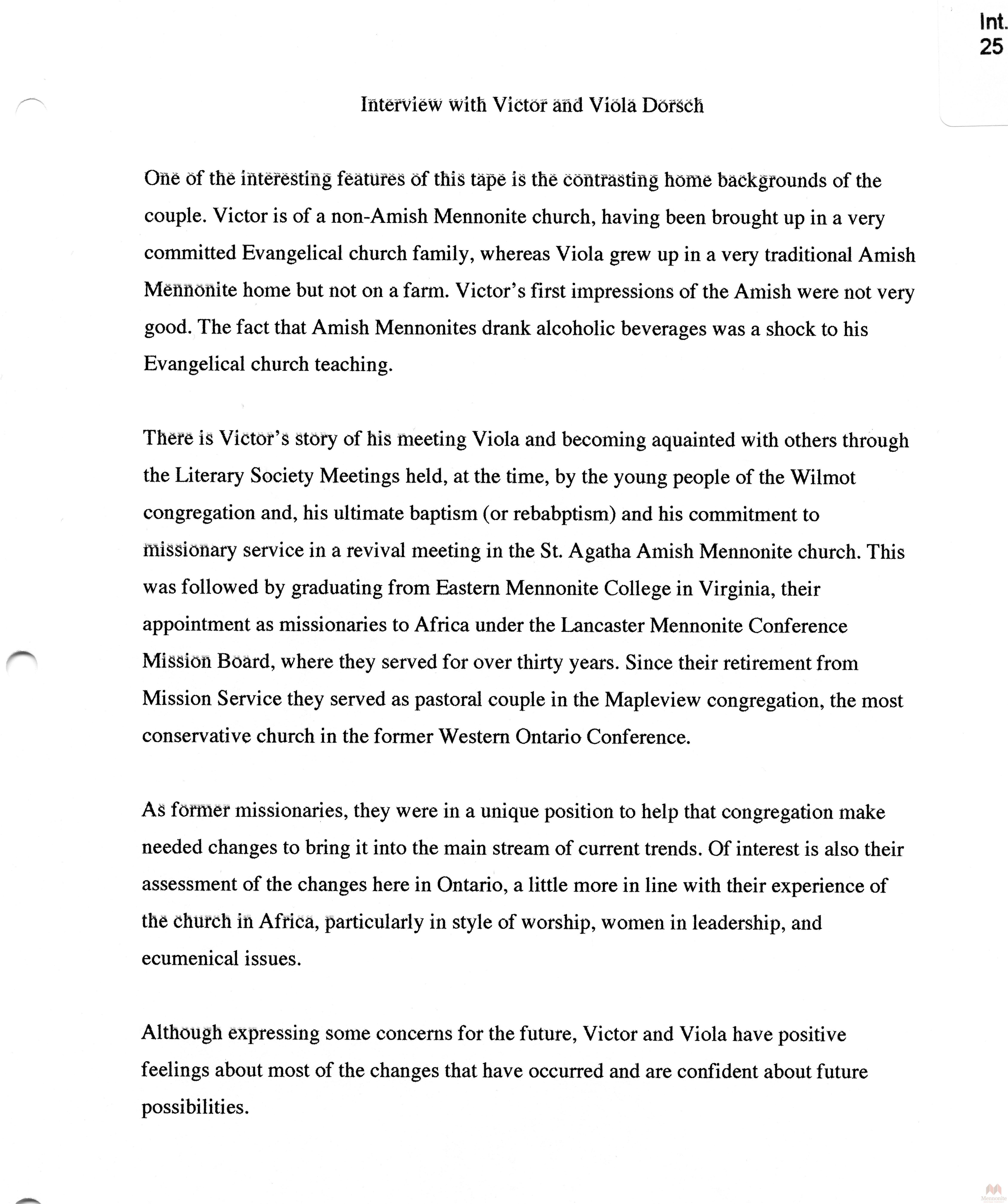 Keywords Hist.Mss.22.7, Oral, History, Amish, Mennonite, Ontario, Summaries, Releases, stories, recollections, Southwestern Ontario, Amish Mennonite Oral History Project, Conrad Grebel College, Victor Dorsch, Viola Dorsch,