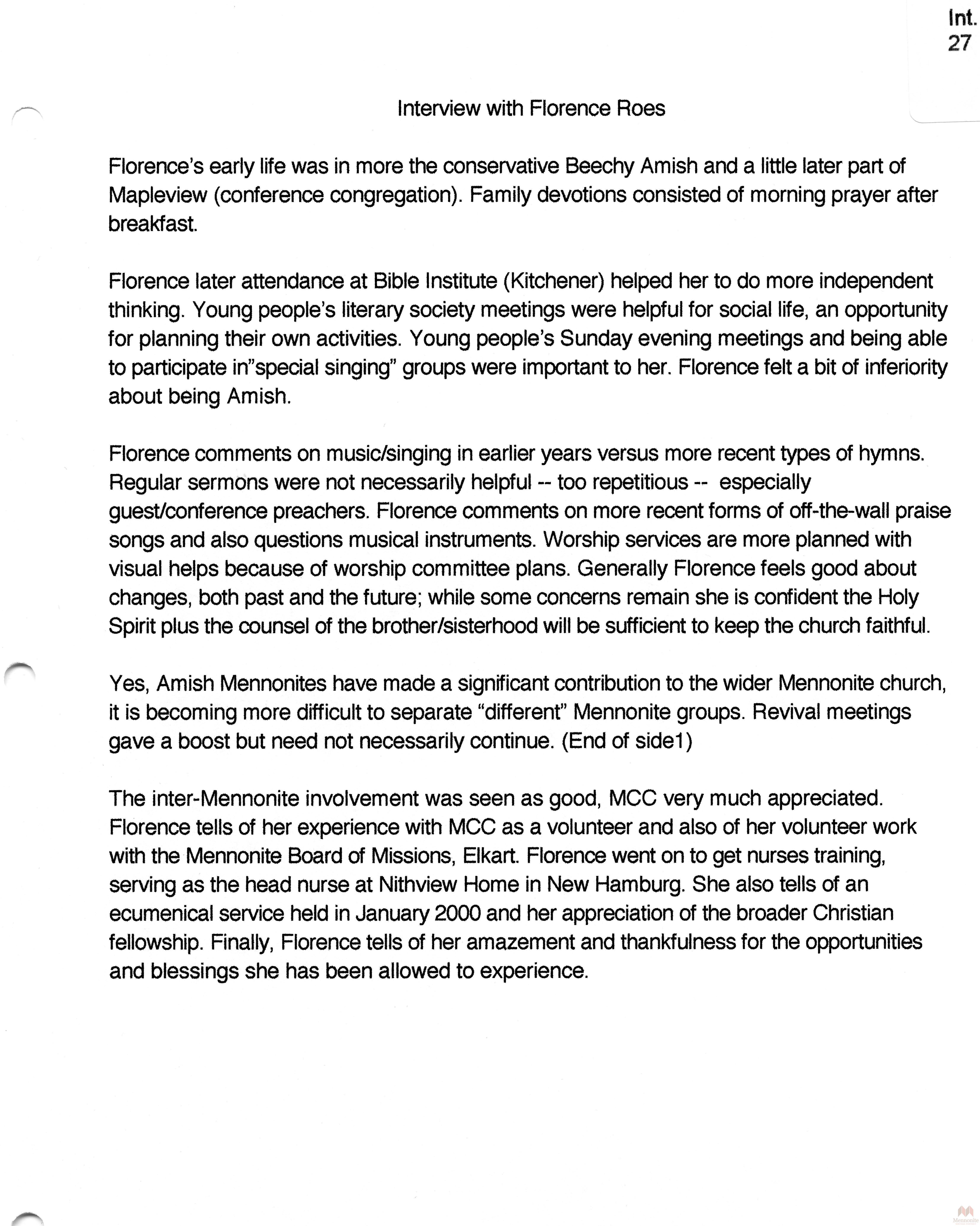 Keywords Hist.Mss.22.7, Oral, History, Amish, Mennonite, Ontario, Summaries, Releases, stories, recollections, Southwestern Ontario, Amish Mennonite Oral History Project, Conrad Grebel College, Florence Roes