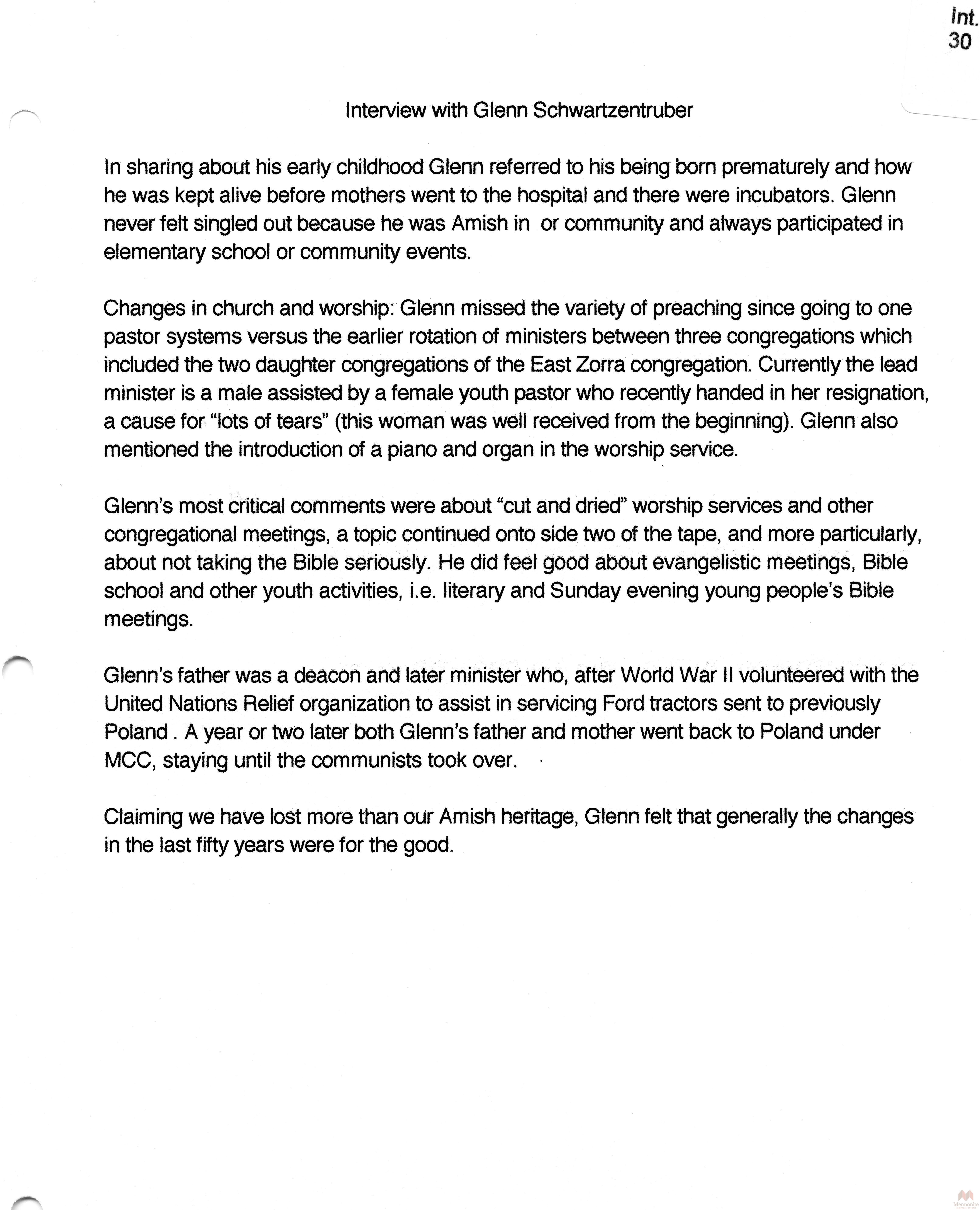 Hist.Mss.22.7 Oral History, Amish Mennonite Experience in Ontario - Summeries & Releases