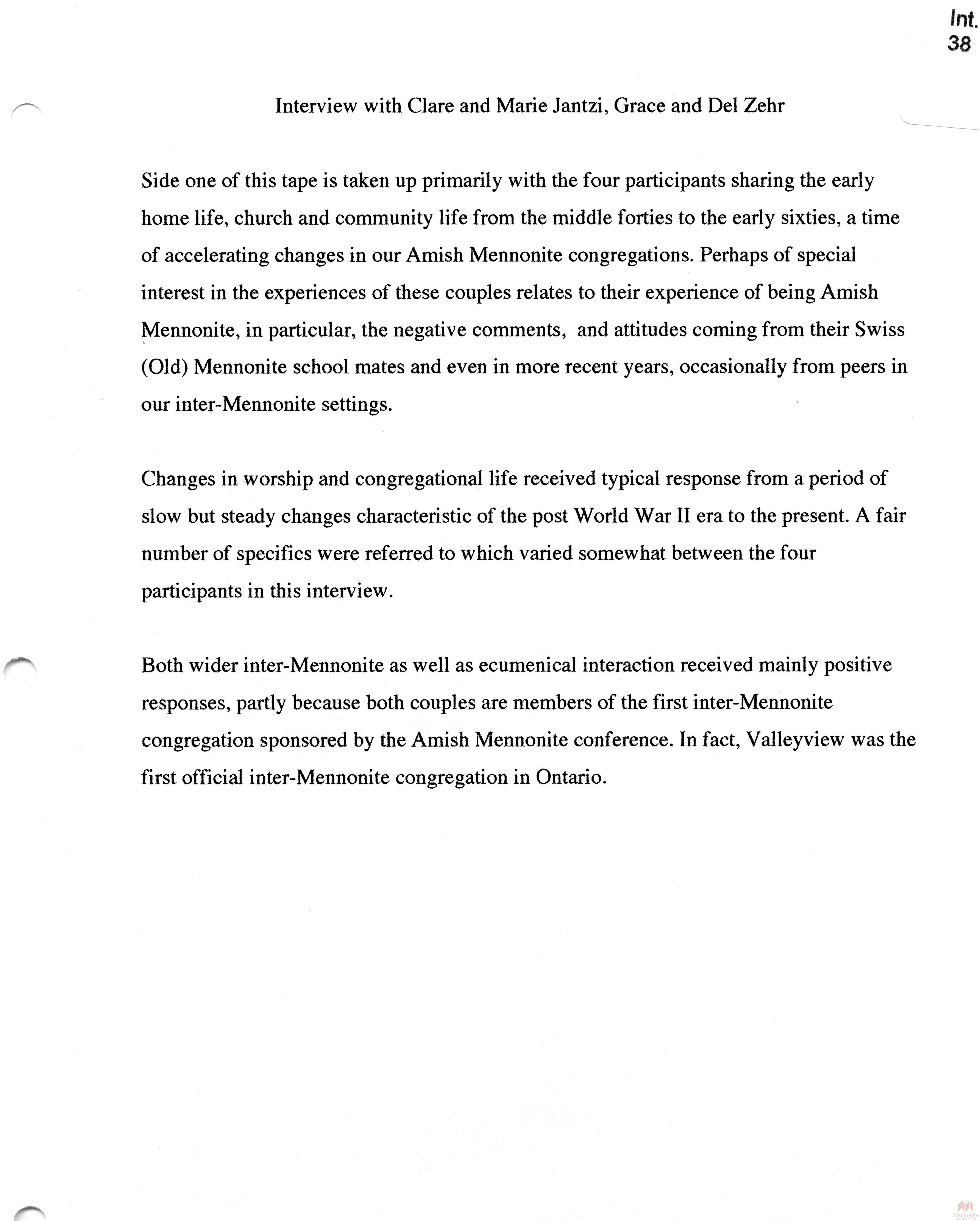 Keywords Claire Jantzi, Marie Jantzi, Grace Zehr, Del Zehr, Hist.Mss.22.7, Oral, History, Amish, Mennonite, Ontario, Summaries, Releases, stories, recollections, Southwestern Ontario, Amish Mennonite Oral History Project, Conrad Grebel College,
