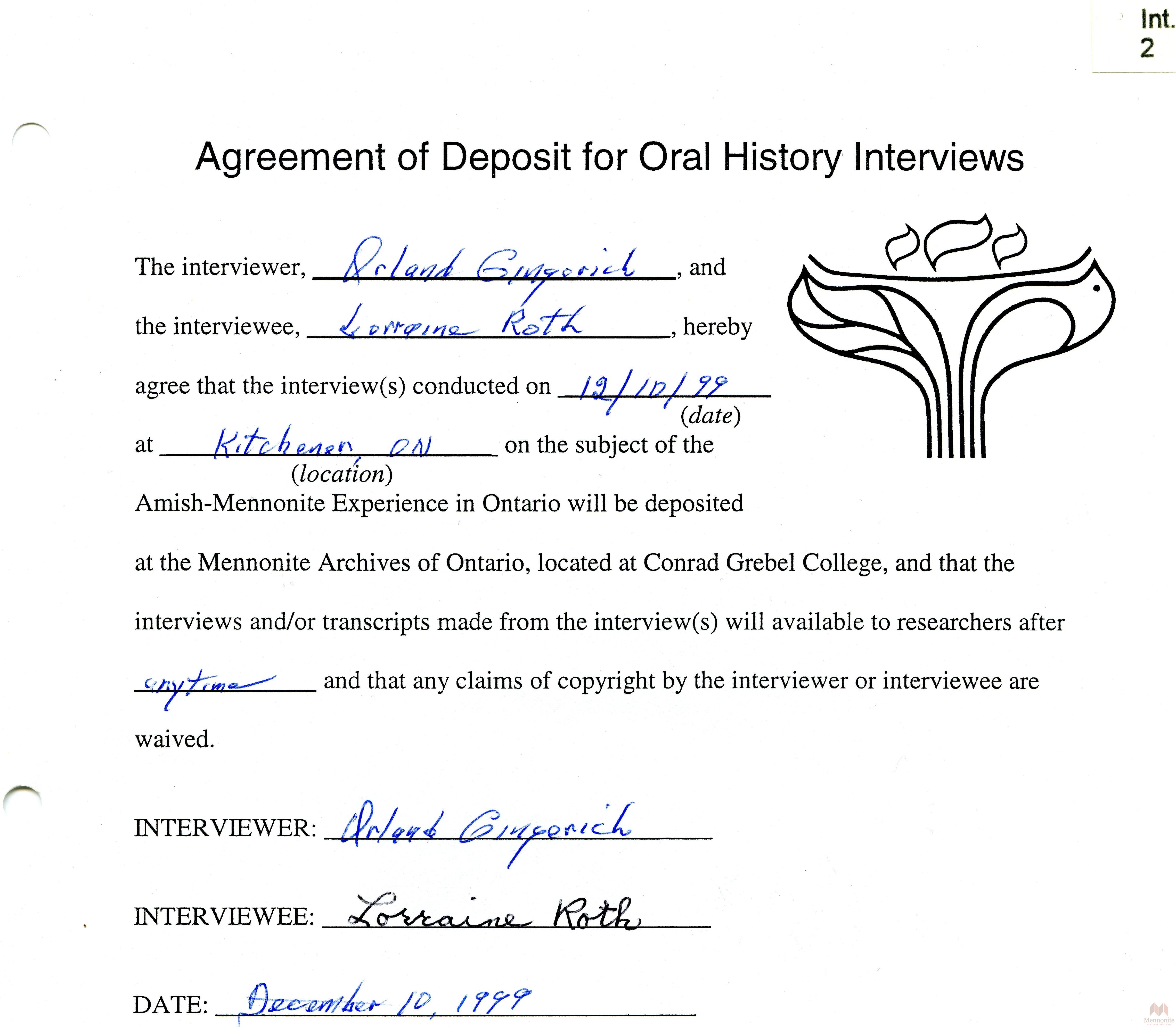 Keywords Lorraine Roth, Hist.Mss.22.7, Oral, History, Amish, Mennonite, Ontario, Summaries, Releases, stories, recollections, Southwestern Ontario, Amish Mennonite Oral History Project, Conrad Grebel College, agreement, deposit, Orland Gingerich,