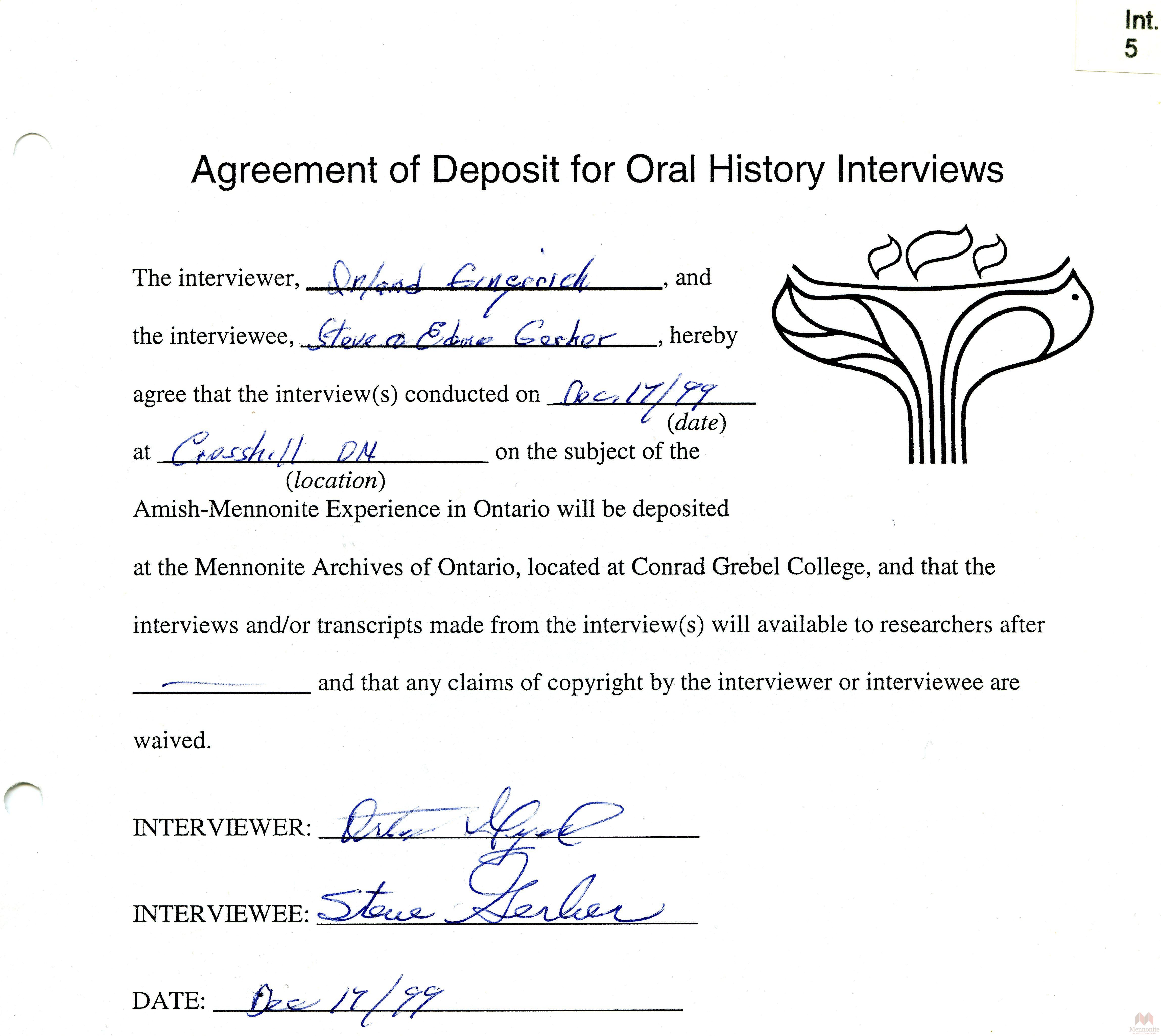 Keywords Steve Gerber, Edna Gerber, Hist.Mss.22.7, Oral, History, Amish, Mennonite, Ontario, Summaries, Releases, stories, recollections, Southwestern Ontario, Amish Mennonite Oral History Project, Conrad Grebel College, agreement, deposit, Orland Gingerich,