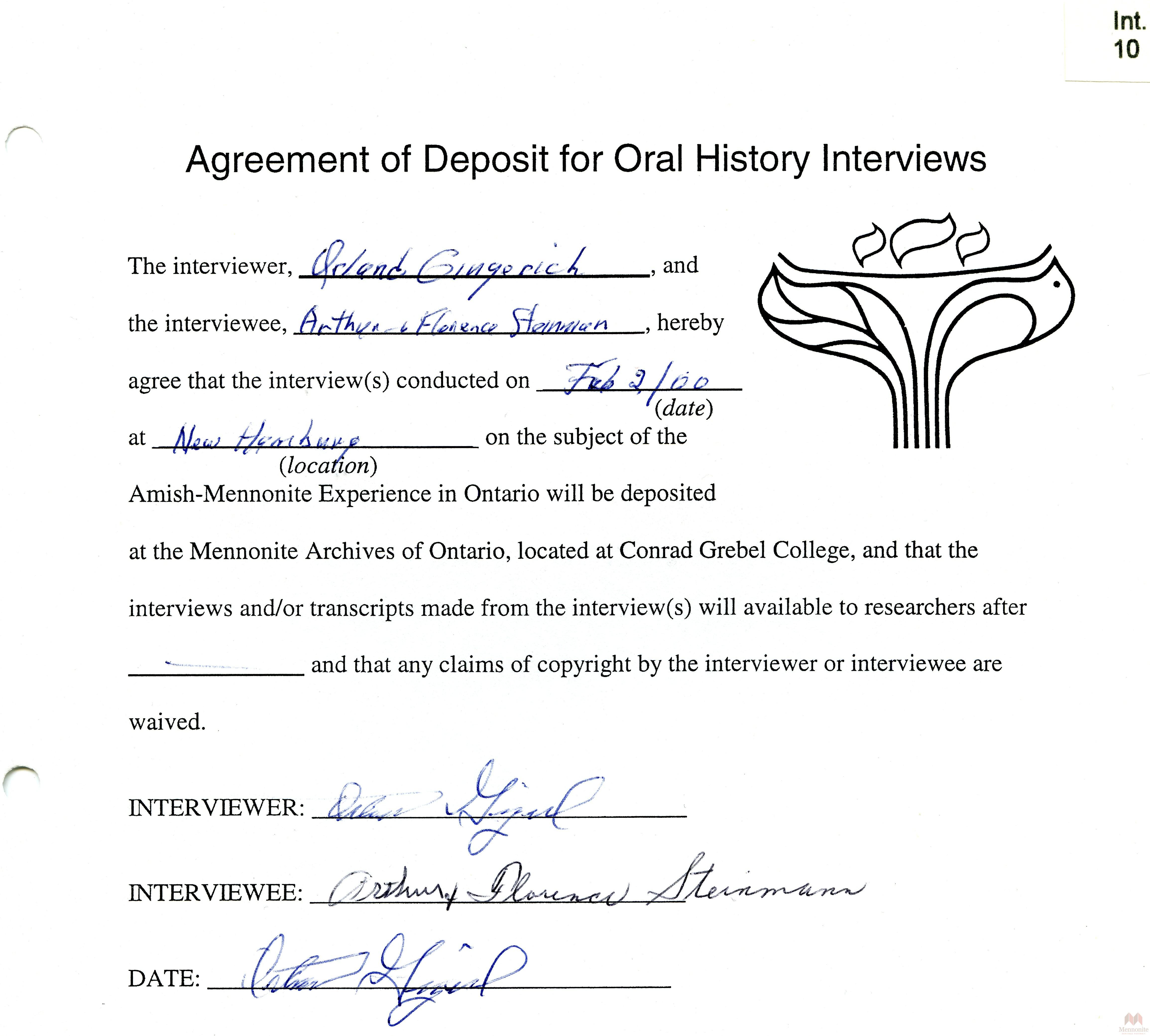 Keywords Hist.Mss.22.7, Oral, History, Amish, Mennonite, Ontario, Summaries, Releases, stories, recollections, Southwestern Ontario, Amish Mennonite Oral History Project, Conrad Grebel College, agreement, deposit, Orland Gingerich, Arthur and Florence Steinman
