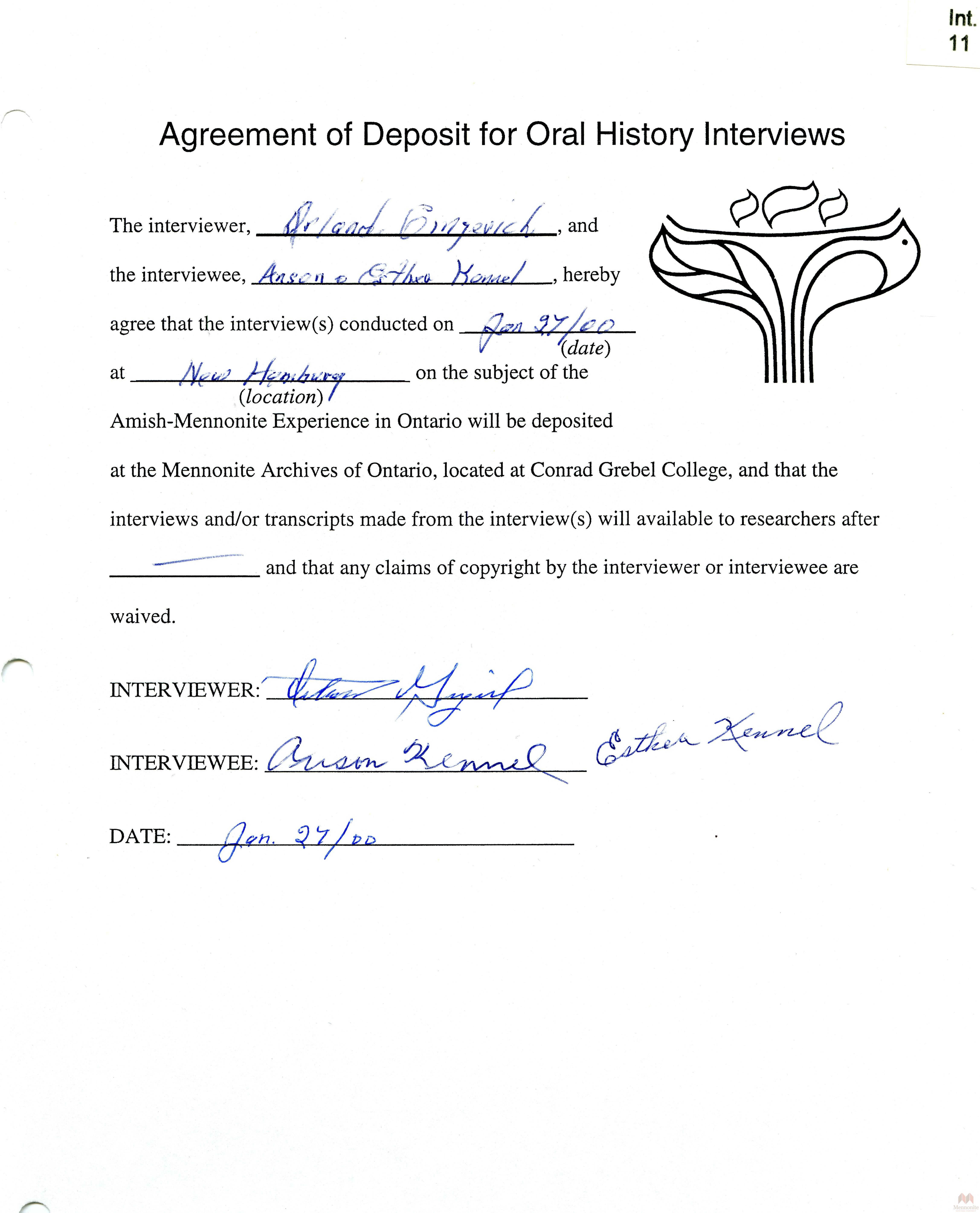 From the collection:Hist.Mss.22.7 Oral History, Amish Mennonite Experience in Ontario - Summeries & Releases