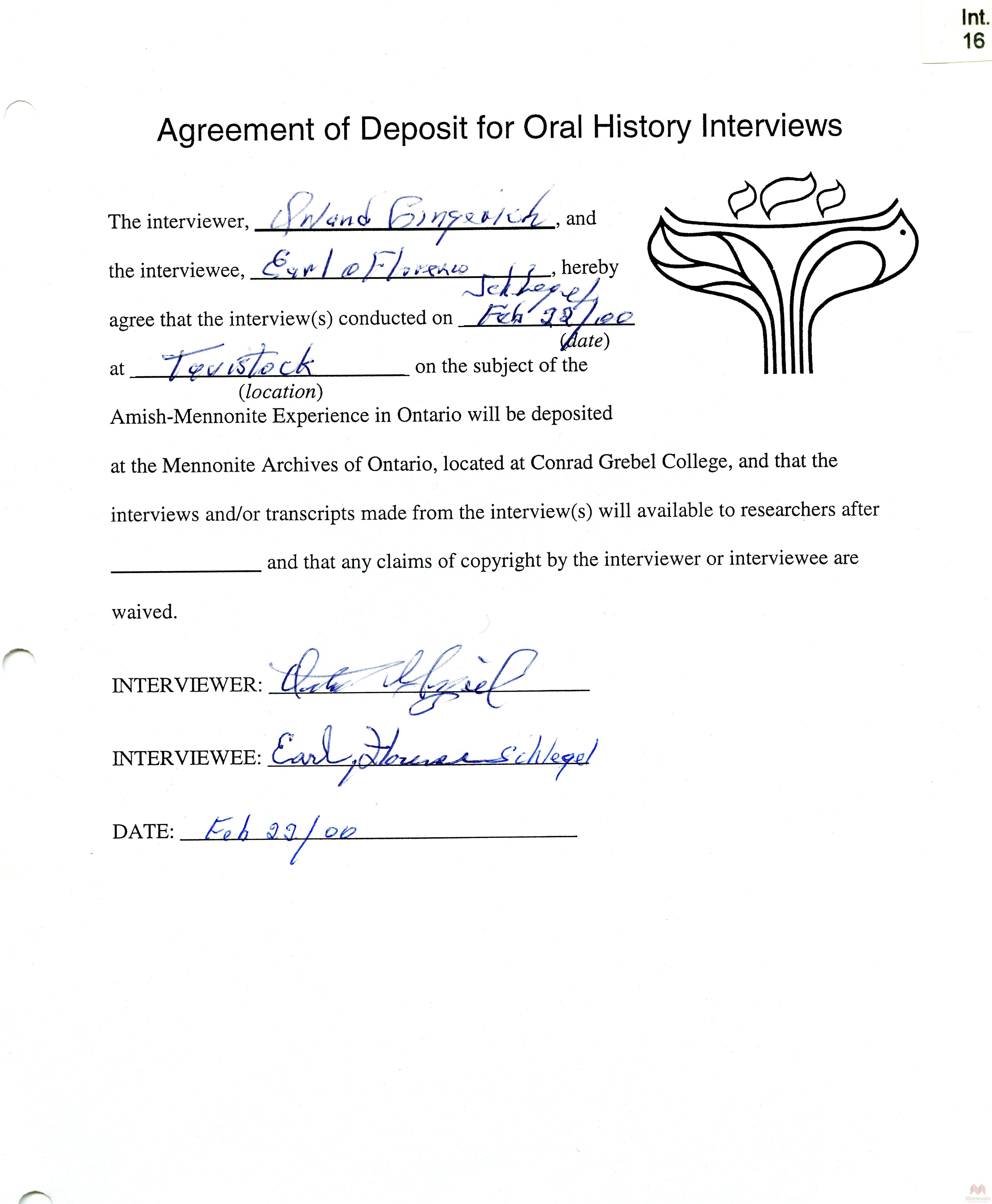 Keywords Hist.Mss.22.7, Oral, History, Amish, Mennonite, Ontario, Summaries, Releases, stories, recollections, Southwestern Ontario, Amish Mennonite Oral History Project, Conrad Grebel College, agreement, deposit, Orland Gingerich, Earl Schlegel, Florence Schlegel