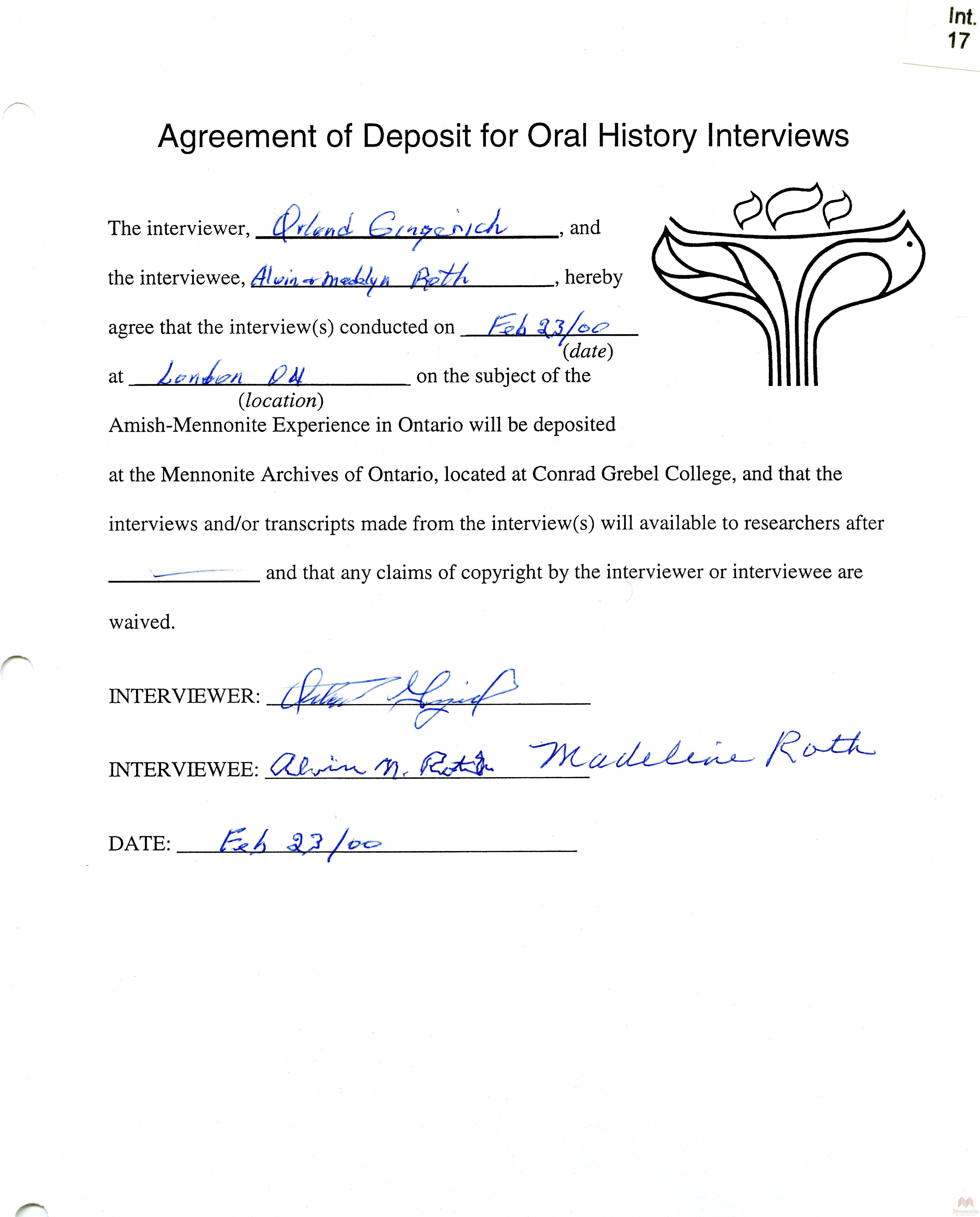 Keywords Hist.Mss.22.7, Oral, History, Amish, Mennonite, Ontario, Summaries, Releases, stories, recollections, Southwestern Ontario, Amish Mennonite Oral History Project, Conrad Grebel College, agreement, deposit, Orland Gingerich, Alvin Roth, Madeline Roth