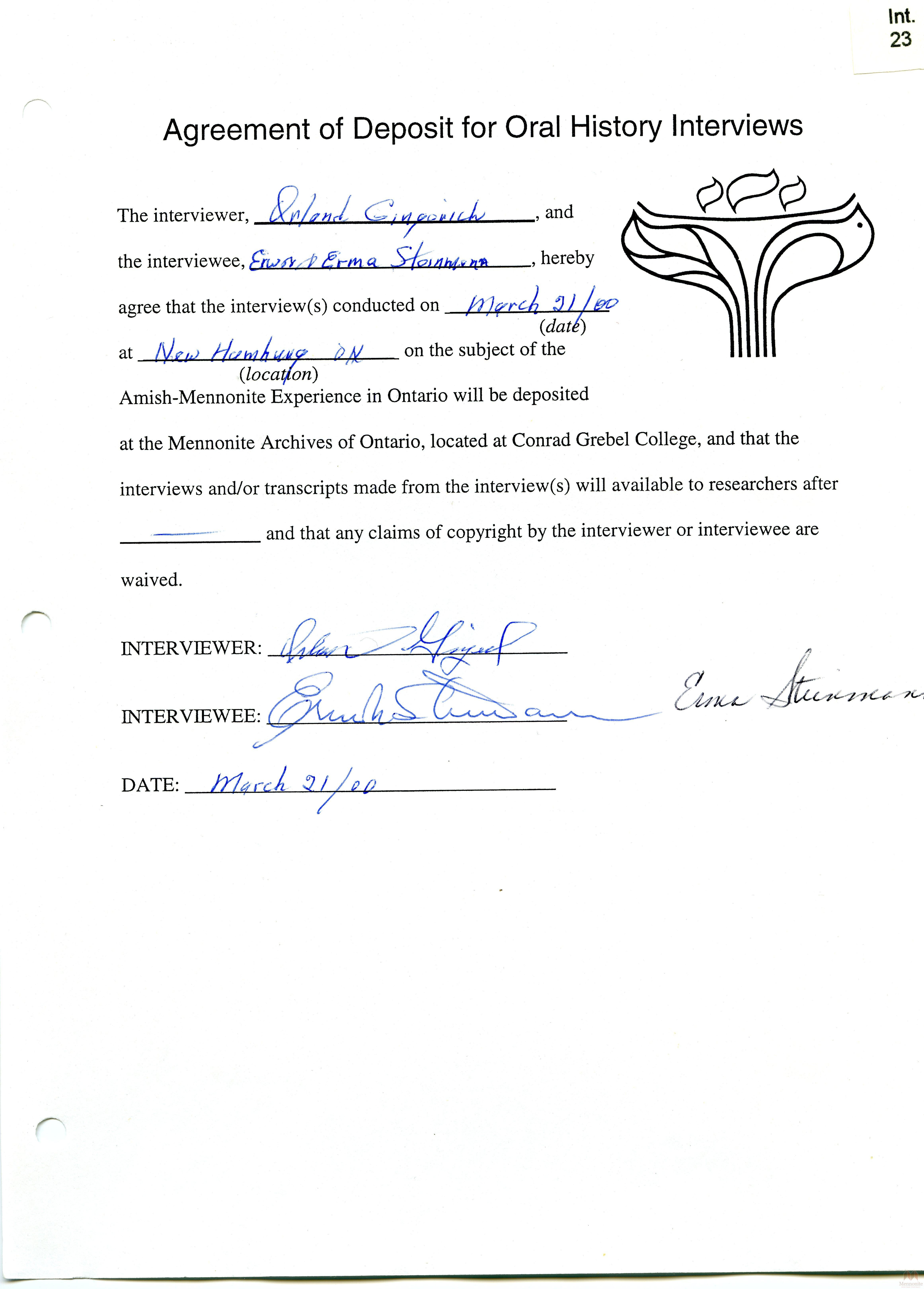 Keywords Hist.Mss.22.7, Oral, History, Amish, Mennonite, Ontario, Summaries, Releases, stories, recollections, Southwestern Ontario, Amish Mennonite Oral History Project, Conrad Grebel College, agreement, deposit, Orland Gingerich, Erwin Steinmann, Erma Steinmann,