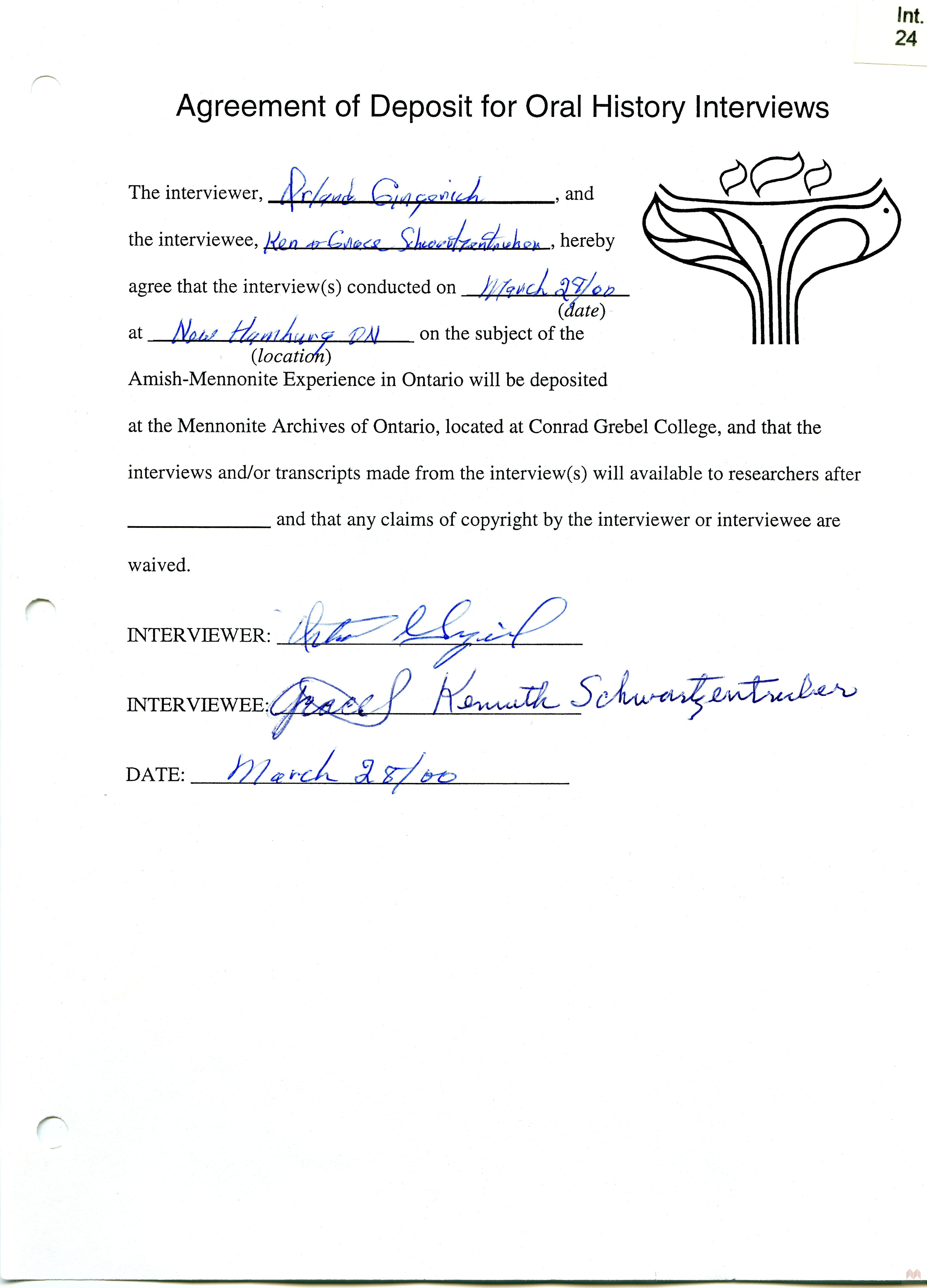 Keywords Grace Schwartzentruber, Kenneth Schwartzentruber, Hist.Mss.22.7, Oral, History, Amish, Mennonite, Ontario, Summaries, Releases, stories, recollections, Southwestern Ontario, Amish Mennonite Oral History Project, Conrad Grebel College,