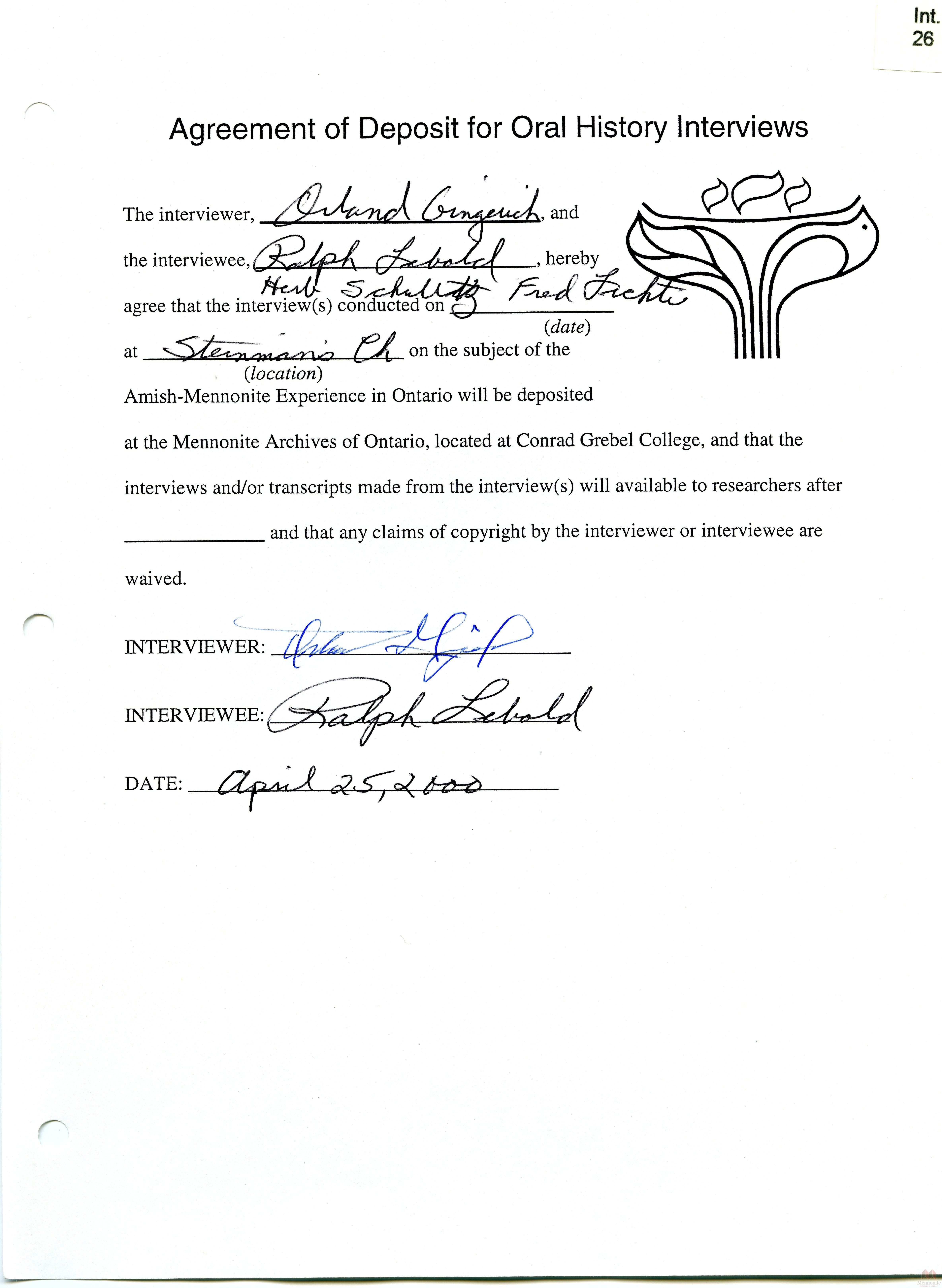 Keywords Ralph Lebold, Herb Schultz, Fred Lichti, Hist.Mss.22.7, Oral, History, Amish, Mennonite, Ontario, Summaries, Releases, stories, recollections, Southwestern Ontario, Amish Mennonite Oral History Project, Conrad Grebel College, Orland Gingerich