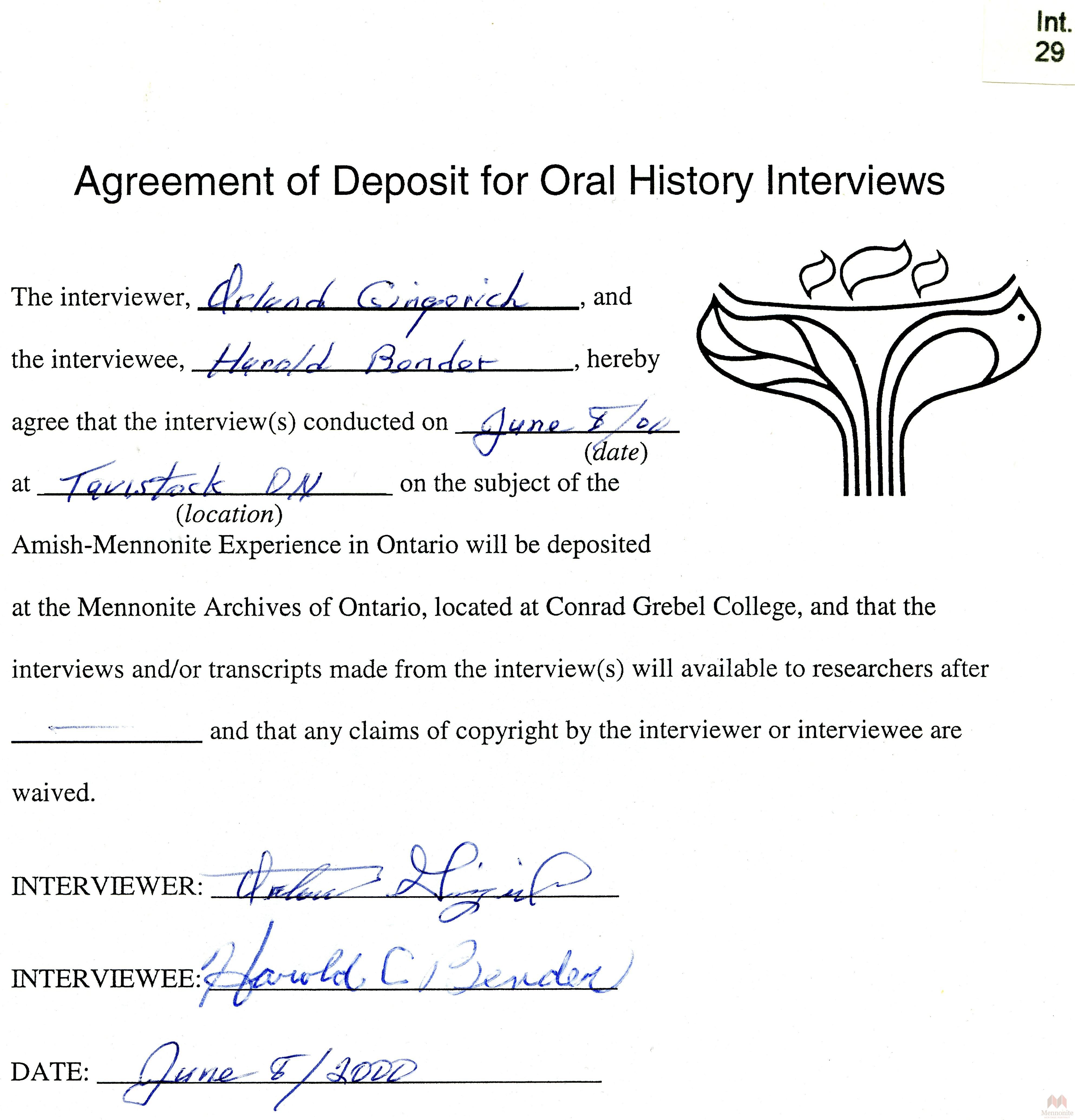 Keywords Harold Bender, Hist.Mss.22.7, Oral, History, Amish, Mennonite, Ontario, Summaries, Releases, stories, recollections, Southwestern Ontario, Amish Mennonite Oral History Project, Conrad Grebel College, Marie Bender, Orland Gingerich