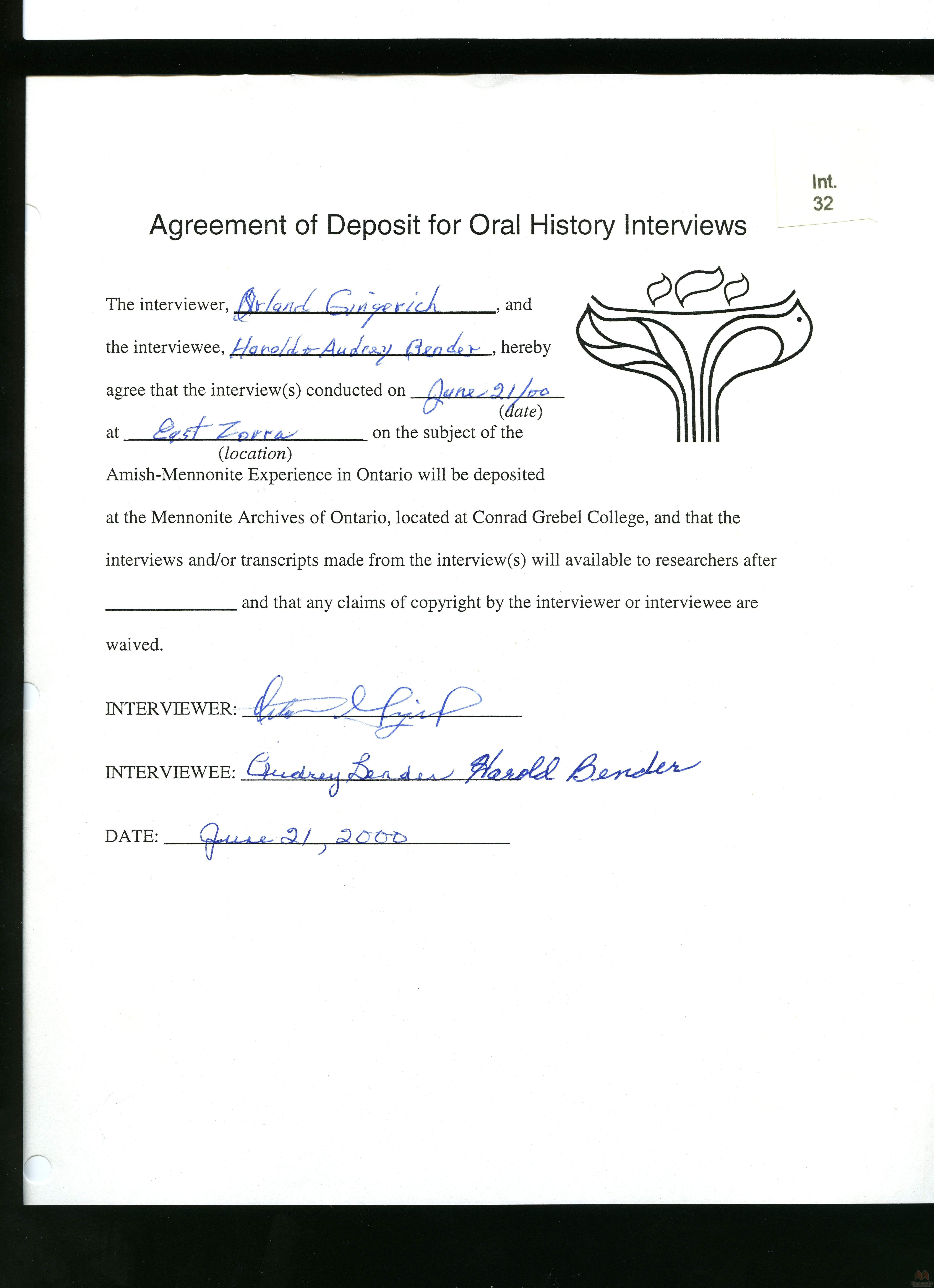 Keywords Hist.Mss.22.7, Oral, History, Amish, Mennonite, Ontario, Summaries, Releases, stories, recollections, Southwestern Ontario, Amish Mennonite Oral History Project, Conrad Grebel College, Harold Bender, Audrey Bender,