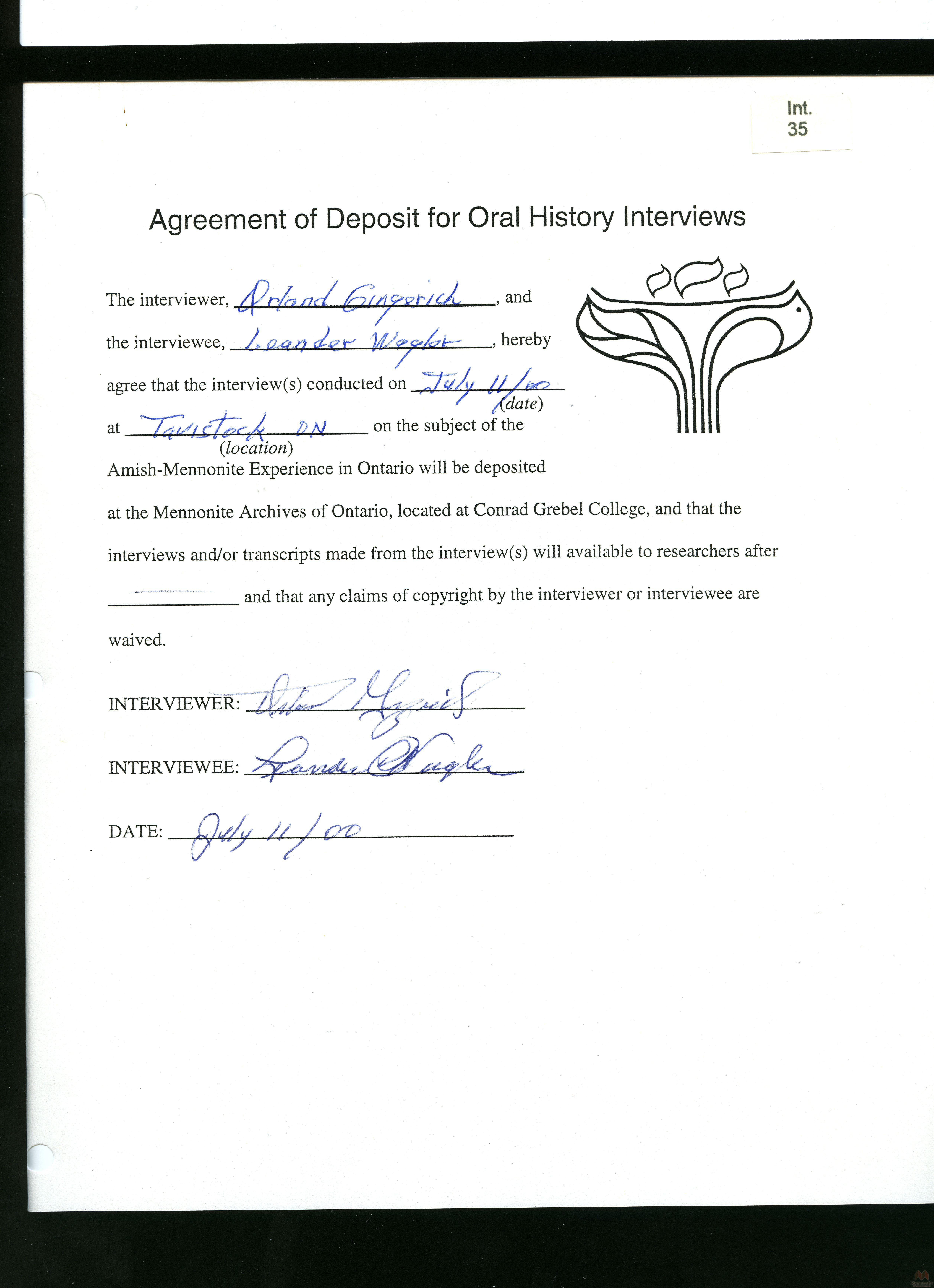 Keywords Leander Wagler, Hist.Mss.22.7, Oral, History, Amish, Mennonite, Ontario, Summaries, Releases, stories, recollections, Southwestern Ontario, Amish Mennonite Oral History Project, Conrad Grebel College, Orland Gingerich