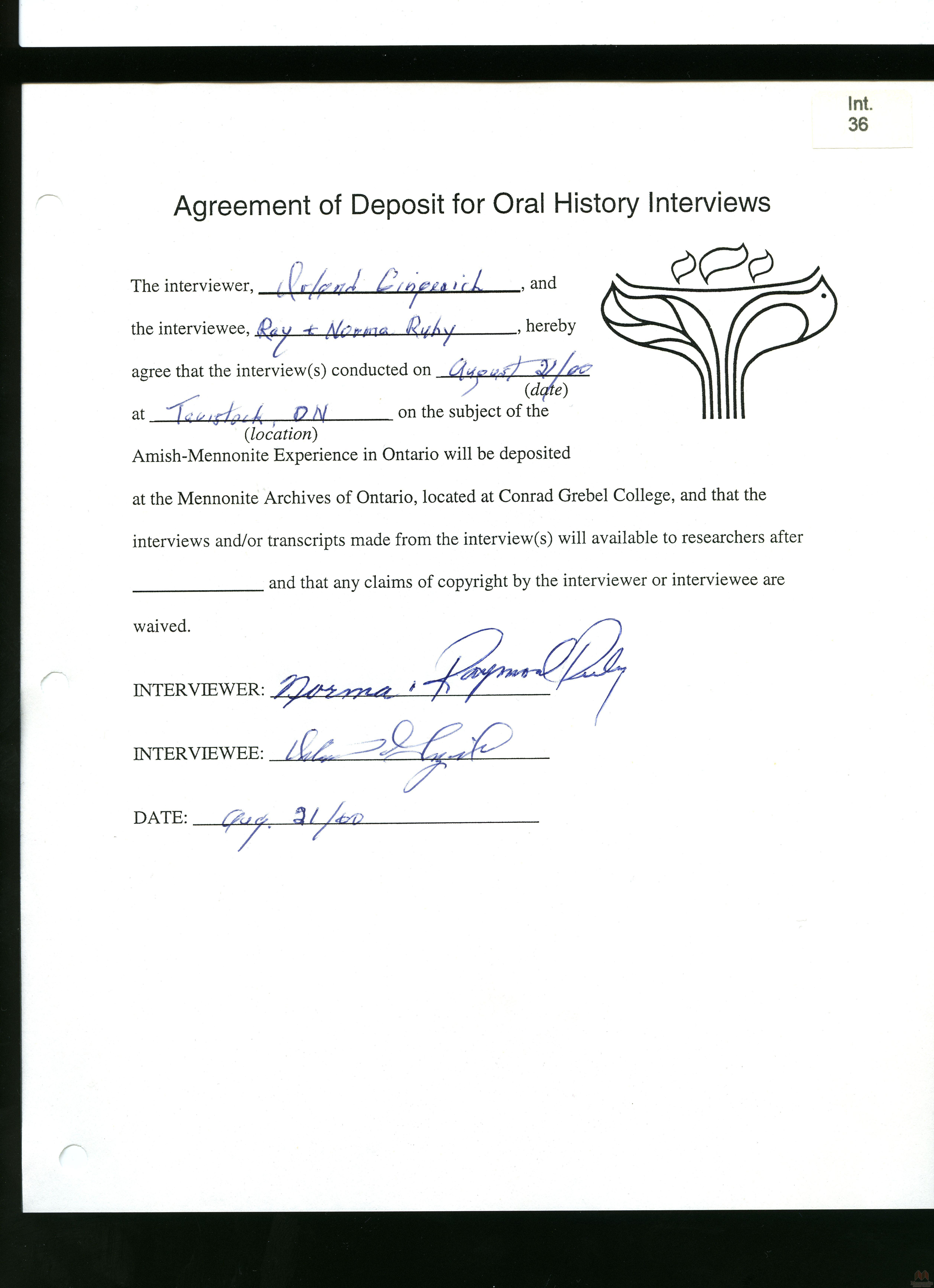Keywords Roy Ruby, Norma Ruby, Hist.Mss.22.7, Oral, History, Amish, Mennonite, Ontario, Summaries, Releases, stories, recollections, Southwestern Ontario, Amish Mennonite Oral History Project, Conrad Grebel College, Orland Gingerich