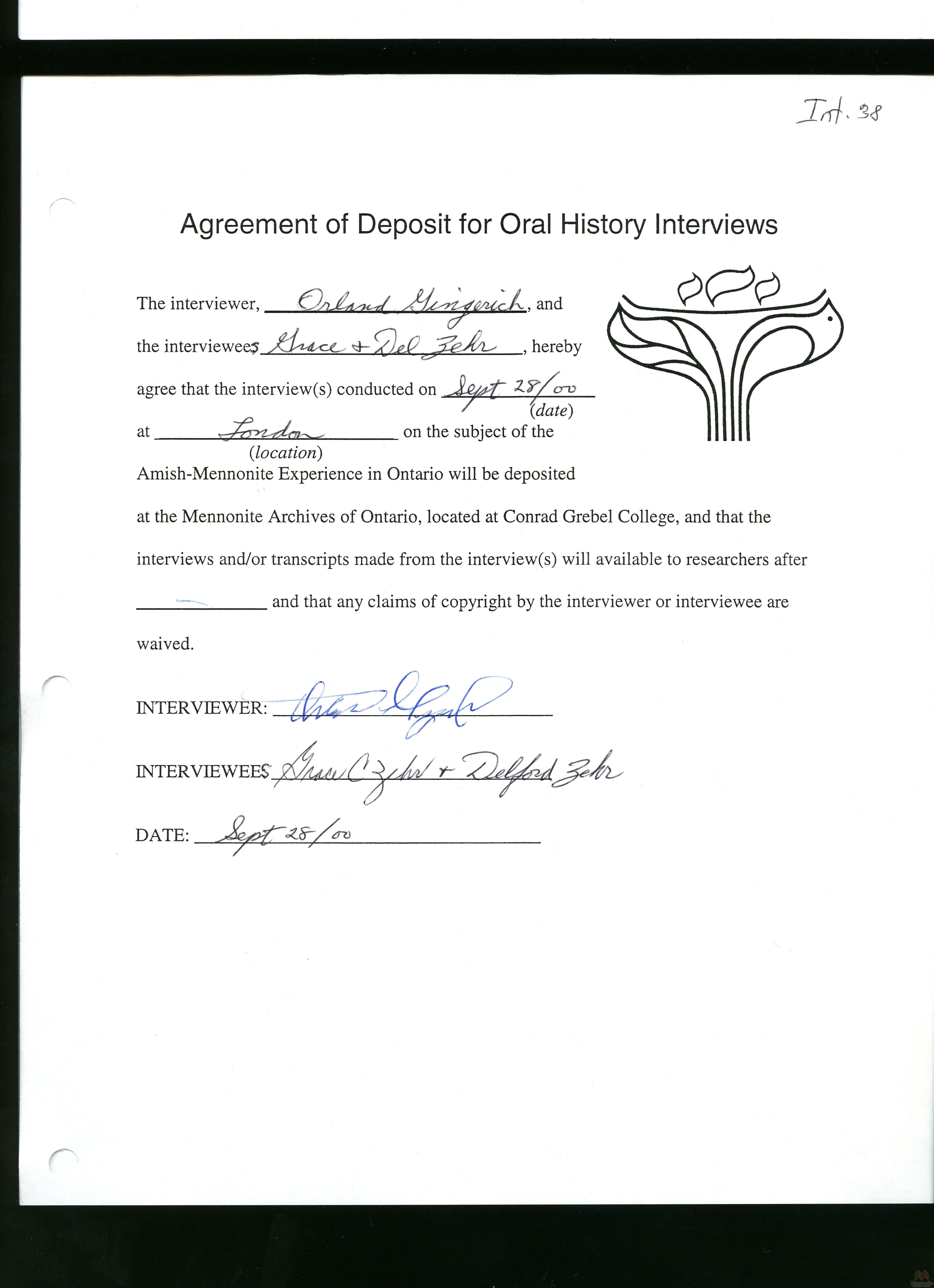 Keywords Grace C. Zehr, Delford Zehr, Hist.Mss.22.7, Oral, History, Amish, Mennonite, Ontario, Summaries, Releases, stories, recollections, Southwestern Ontario, Amish Mennonite Oral History Project, Conrad Grebel College, Orland Gingerich