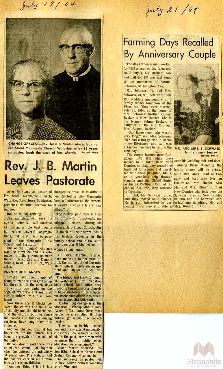 Keywords Rev. Jesse B. Martin, Rev. Milton Schwartzentruber, Mrs. Martin, Bishop, The Record, anniversary, Samuel Schwass, Mrs. Schwass, Selma Becker, August Becker, Idella, New Dundee, Mr. Robert Smith, Mrs. Robert Smith,