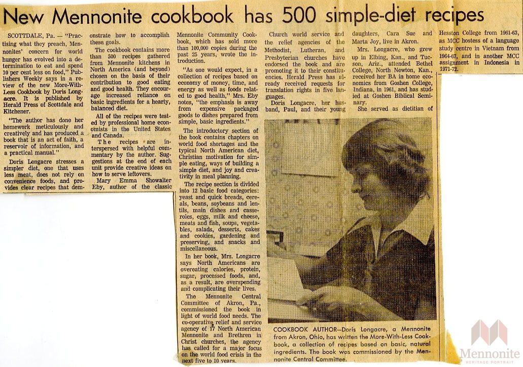 Keywords Doris Longacre, cookbook, Mennonite, relief, aid, world hunger, economics, basic, foods, ingredients, More-With-Less Cookbook, MCC, Mennonite Central Committee, Scottdale, Pa., recipes,