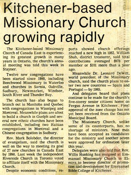 Keywords Emmanuel Bible College of Kitchener, Sarnia, Oakville, Sudbury, Newmarket, Windsor, South River, Kitchener, Thunder Bay, Elmira, Missionary Church, growth, growing, Stayner, Beechwood Missionary, Winnipeg, Guelph, Montreal, Rev. Mark Bolebder, Toronto, William Shuh, Dr. Leonard DeWitt, Rev. Willis Hunking,