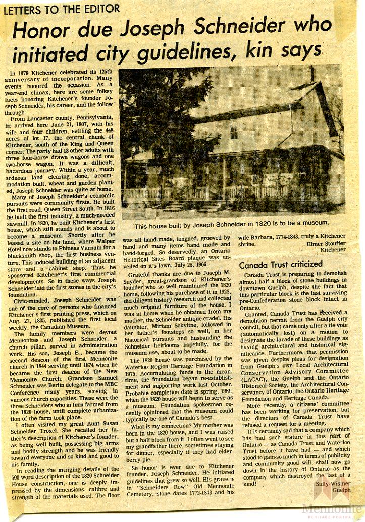 Keywords Joseph Schneider, farm, house, homestead, Kitchener, founding, founder, city, sawmill, museum, Barbara Schneider, printing press, Joseph E. Schneider, Lancaster county, Pennsylvania, Queen Street South, Walper Hotel, Phineas Varnum, Samuel Schneider, New Mennonite Church, Susan Schneider Troxel, Ontario Historical Sites Board plaque, Joseph M. Snyder, Mariam Sokvitne, Waterloo Region Heritage Foundation, Schneiders Row, Old Mennonite Cemetery