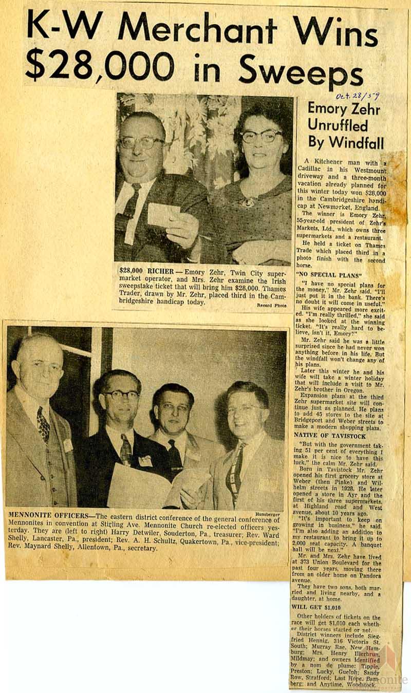Keywords Emory Zehr, sweepstakes, Cambridgeshire, Thames Trader, David Detweiler, Souderton, Pa., Rev. Ward Shelly, Rev. A.H. Schultz, Quakertown, Pa., Rev. Maynard Shelley, Allentown, Pa., Kitchener, Newmarket, England, Tavistock,