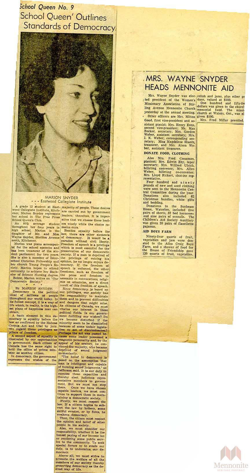 Keywords Marion Snyder, democracy, Eastwood Collegiate Institute, essay, Mrs. Wayne Snyder, president, elected, Women’s Missionary Association, Stirling Avenue Mennonite Church, donations, mission, MCC, relief,