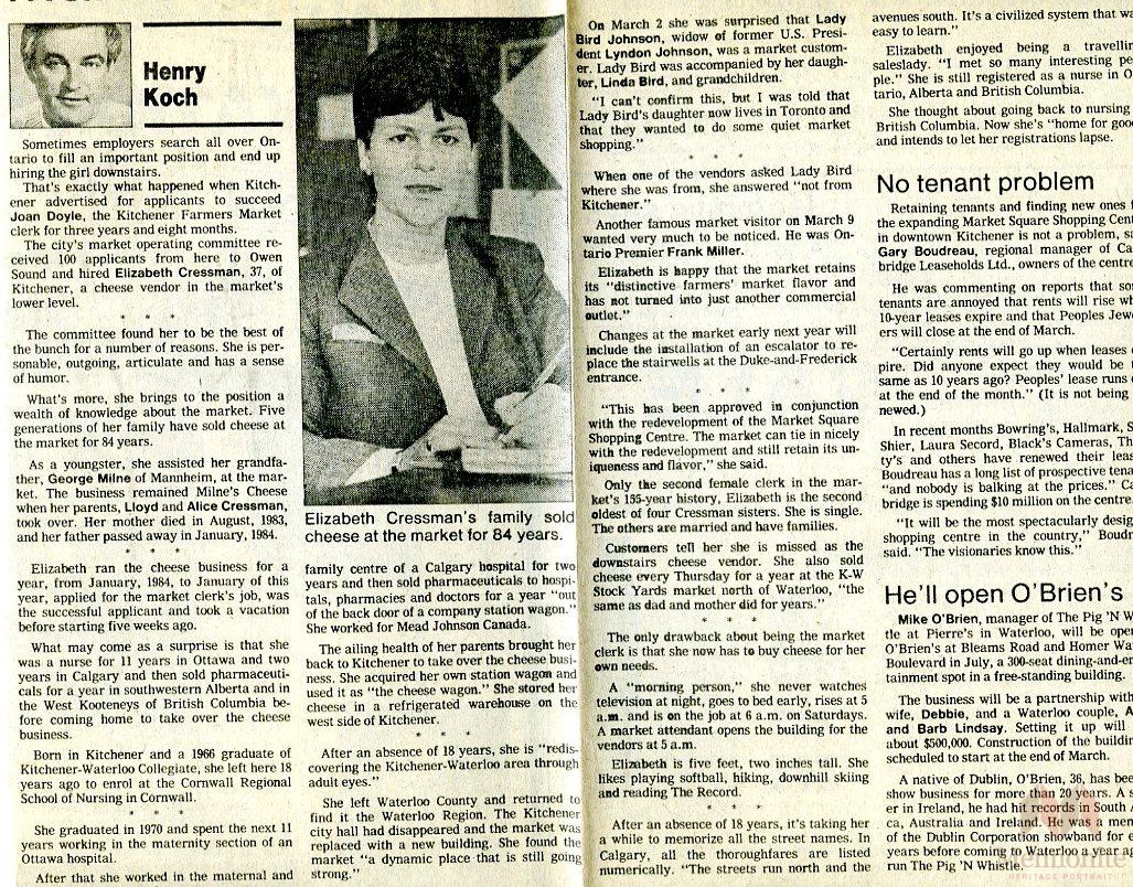 Keywords Elizabeth Cressman, Kitchener market, farmers, clerk, hire, position, cheese, vendor, Milne, George Milne, Lloyd Cressman, Alice Cressman, nurse,